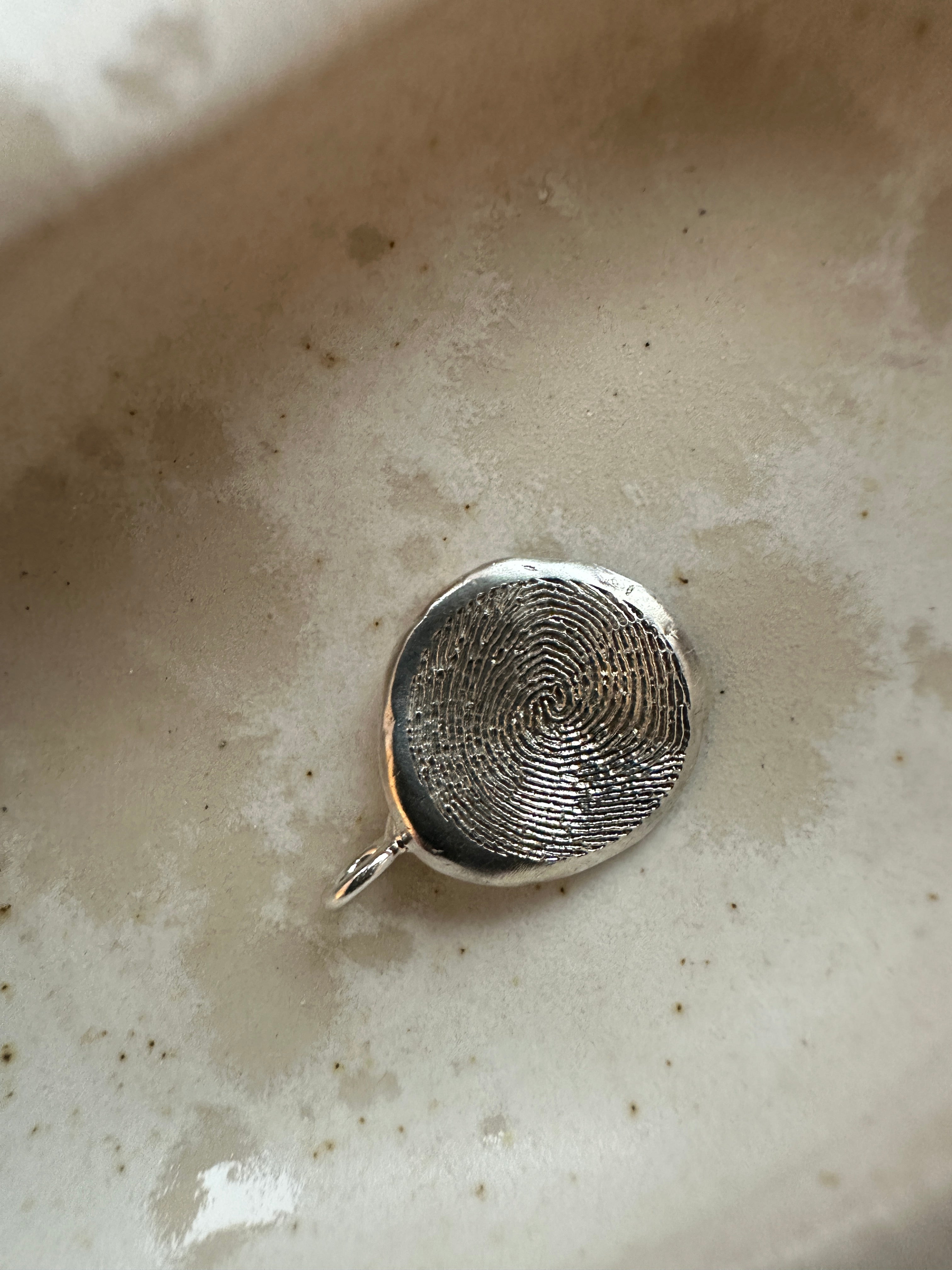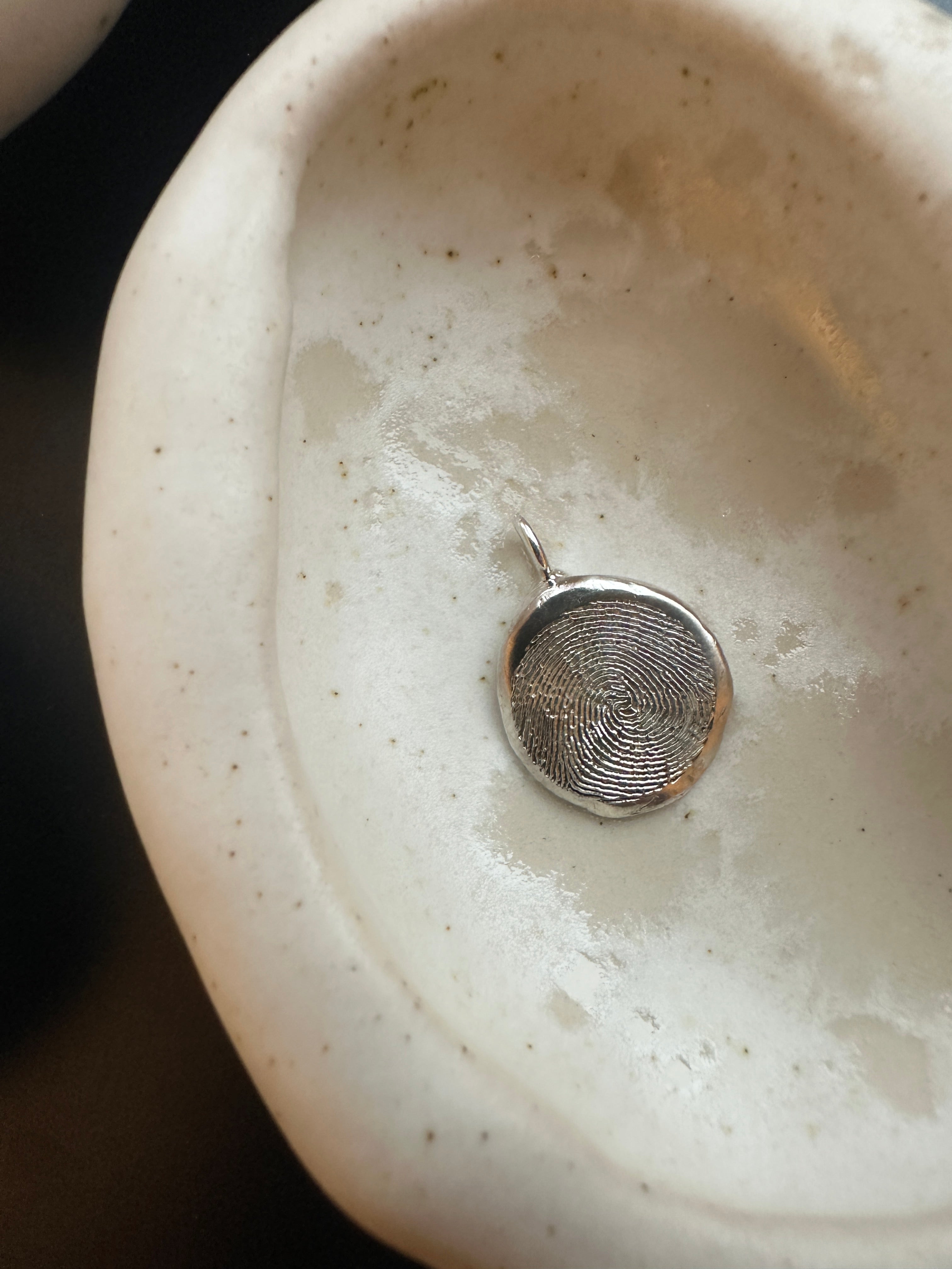 Create a timeless and deeply personal piece of jewelry with our Big Fingerprint Pendant. The shape is organic round finished with a 5 mm hook.