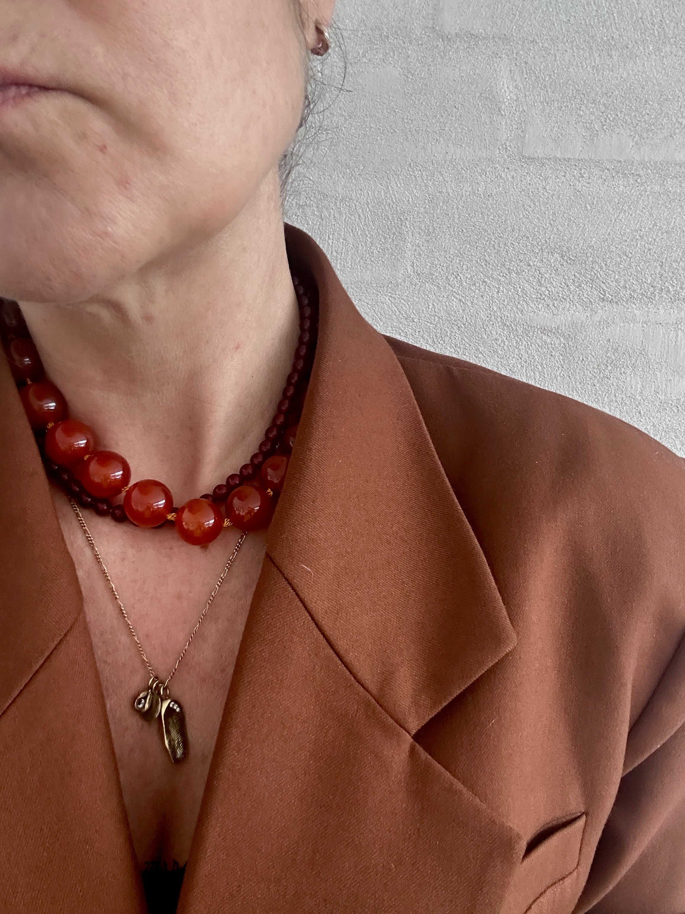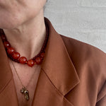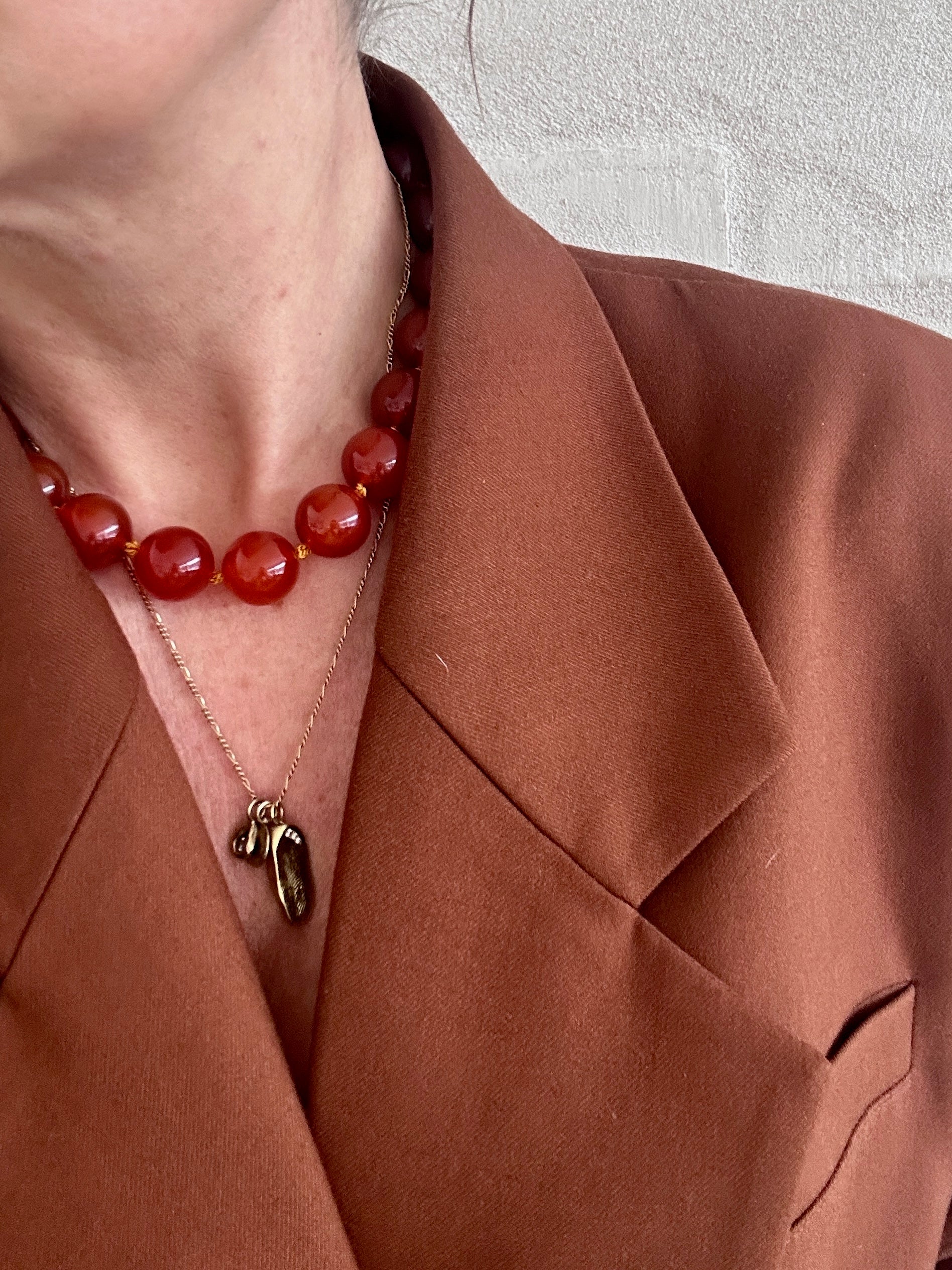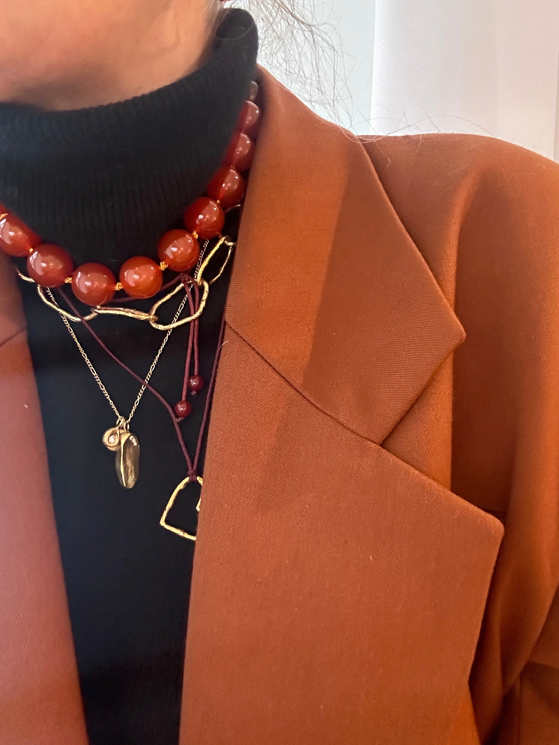 This Karnika necklace is crafted with a striking 16 mm red/orange Carnelian, showcasing the stone’s warm, natural tones and unique character. Each stone is one of a kind, giving the necklace an exclusive and refined look.