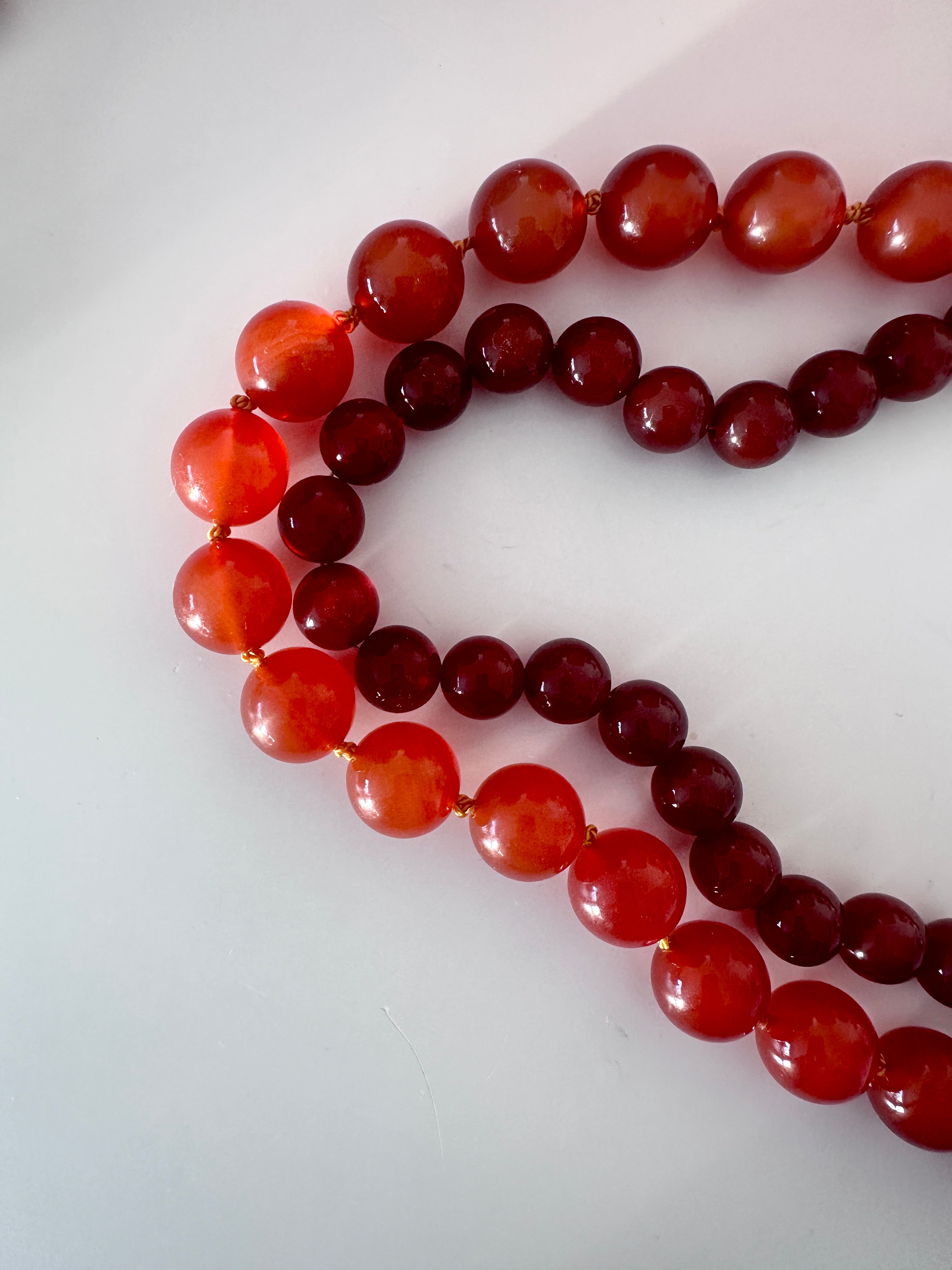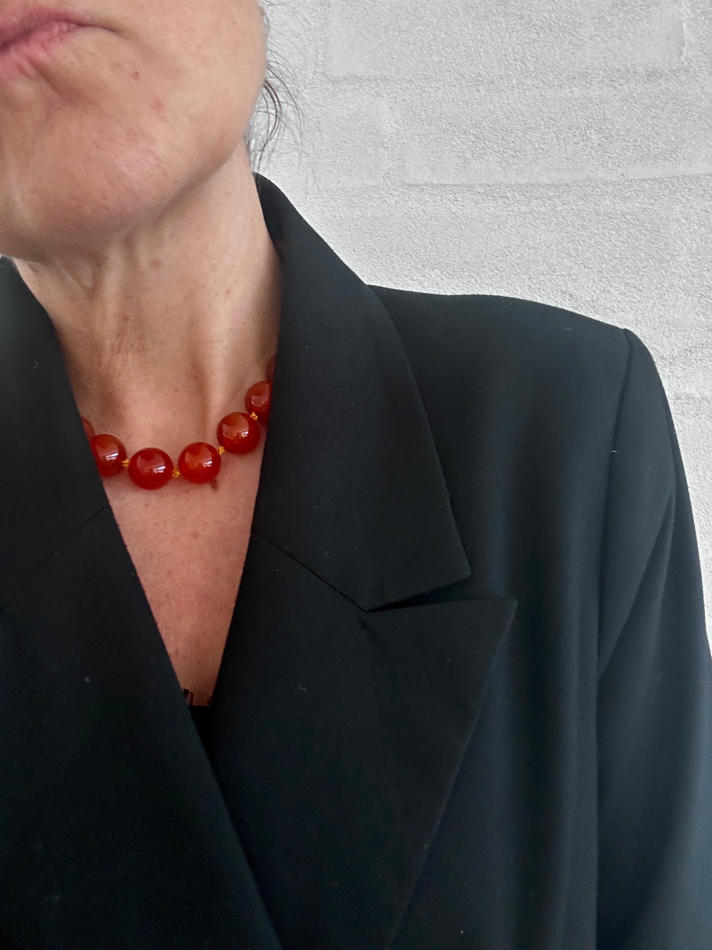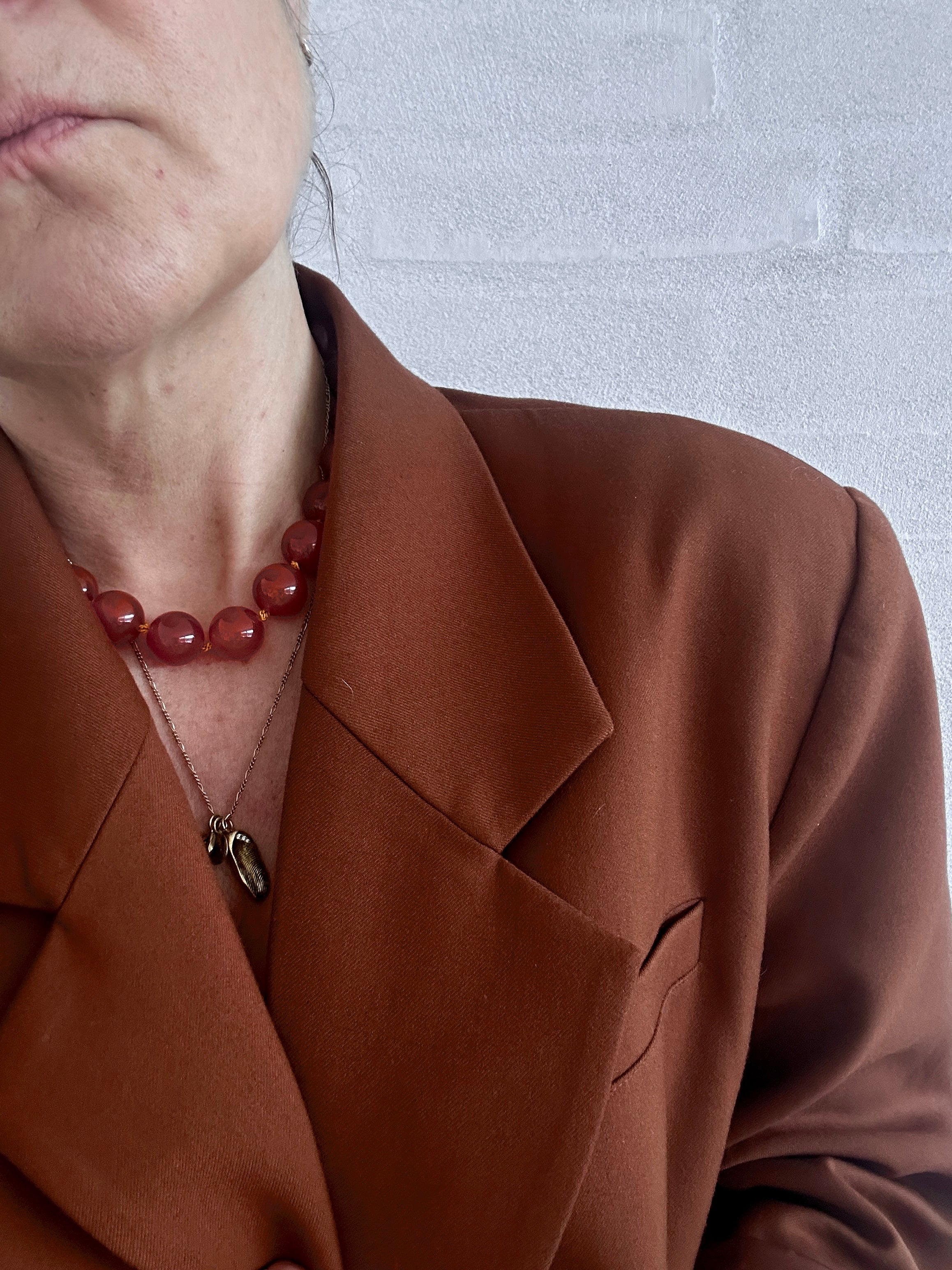 This Karnika necklace is crafted with a striking 16 mm red/orange Carnelian, showcasing the stone’s warm, natural tones and unique character. Each stone is one of a kind, giving the necklace an exclusive and refined look.