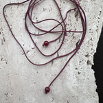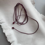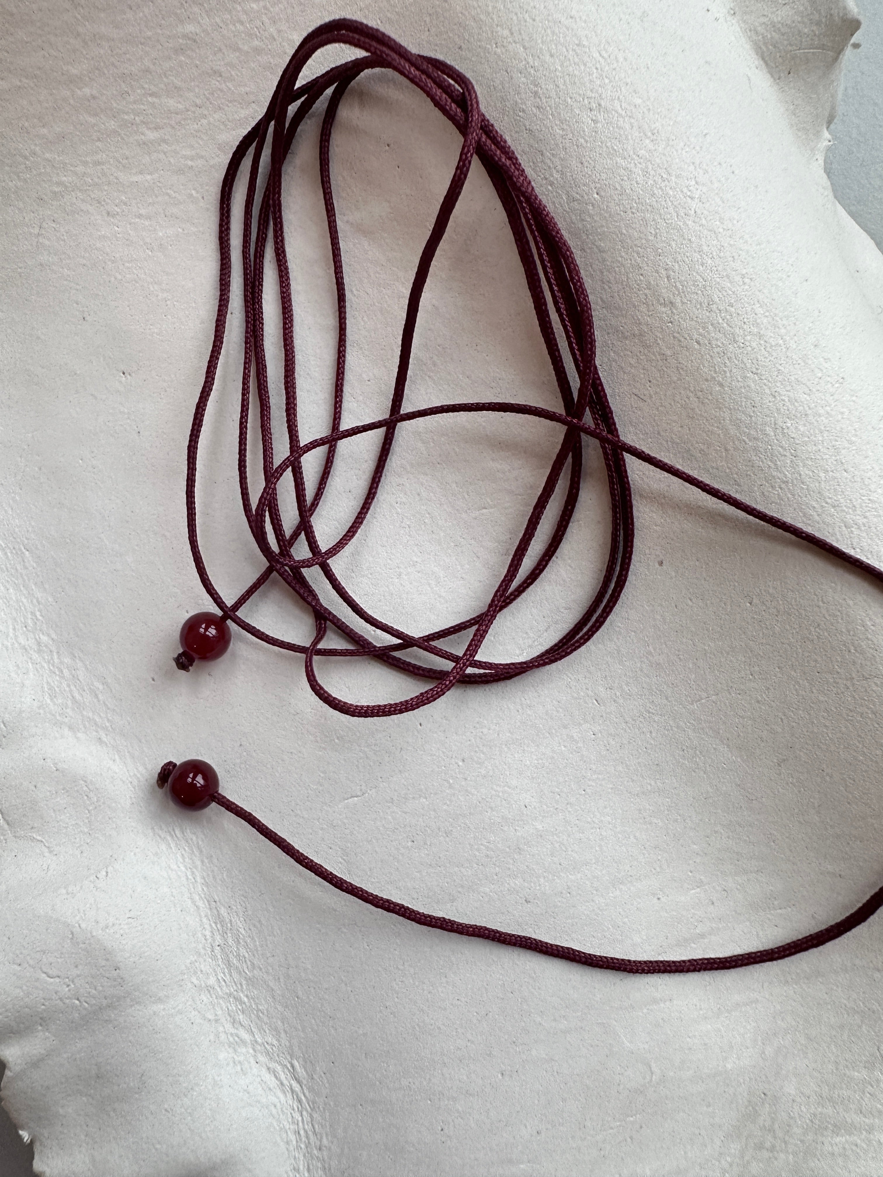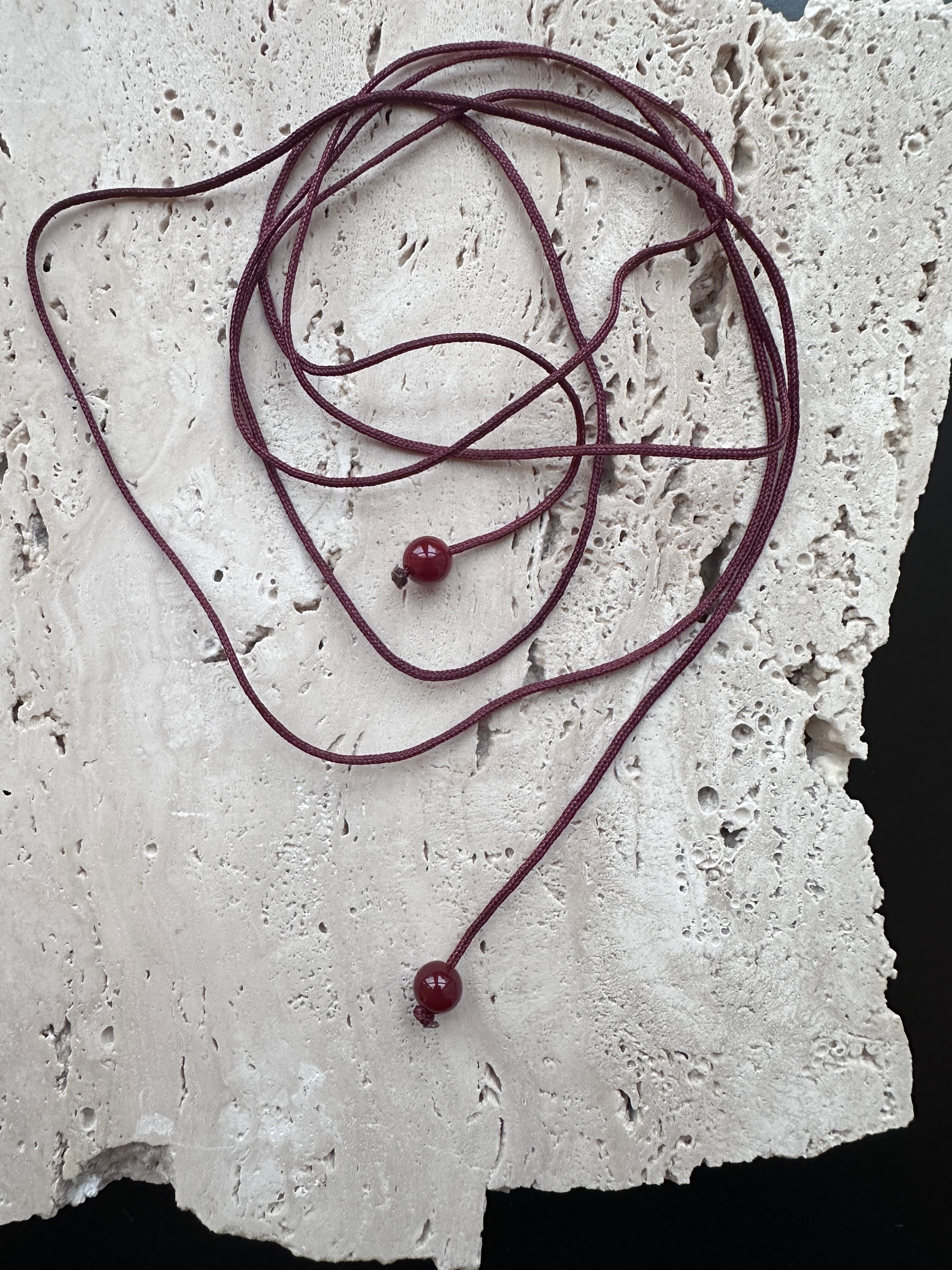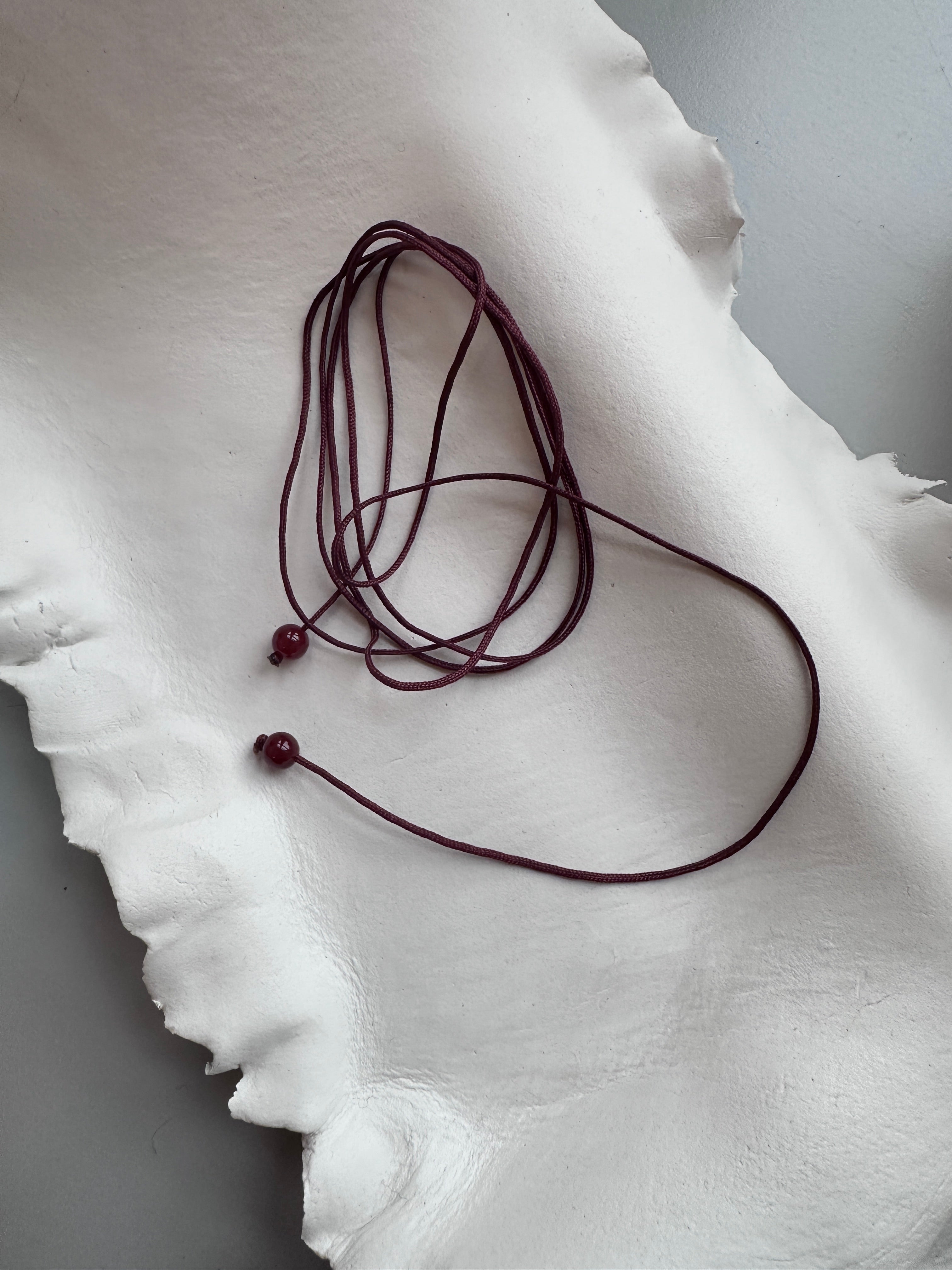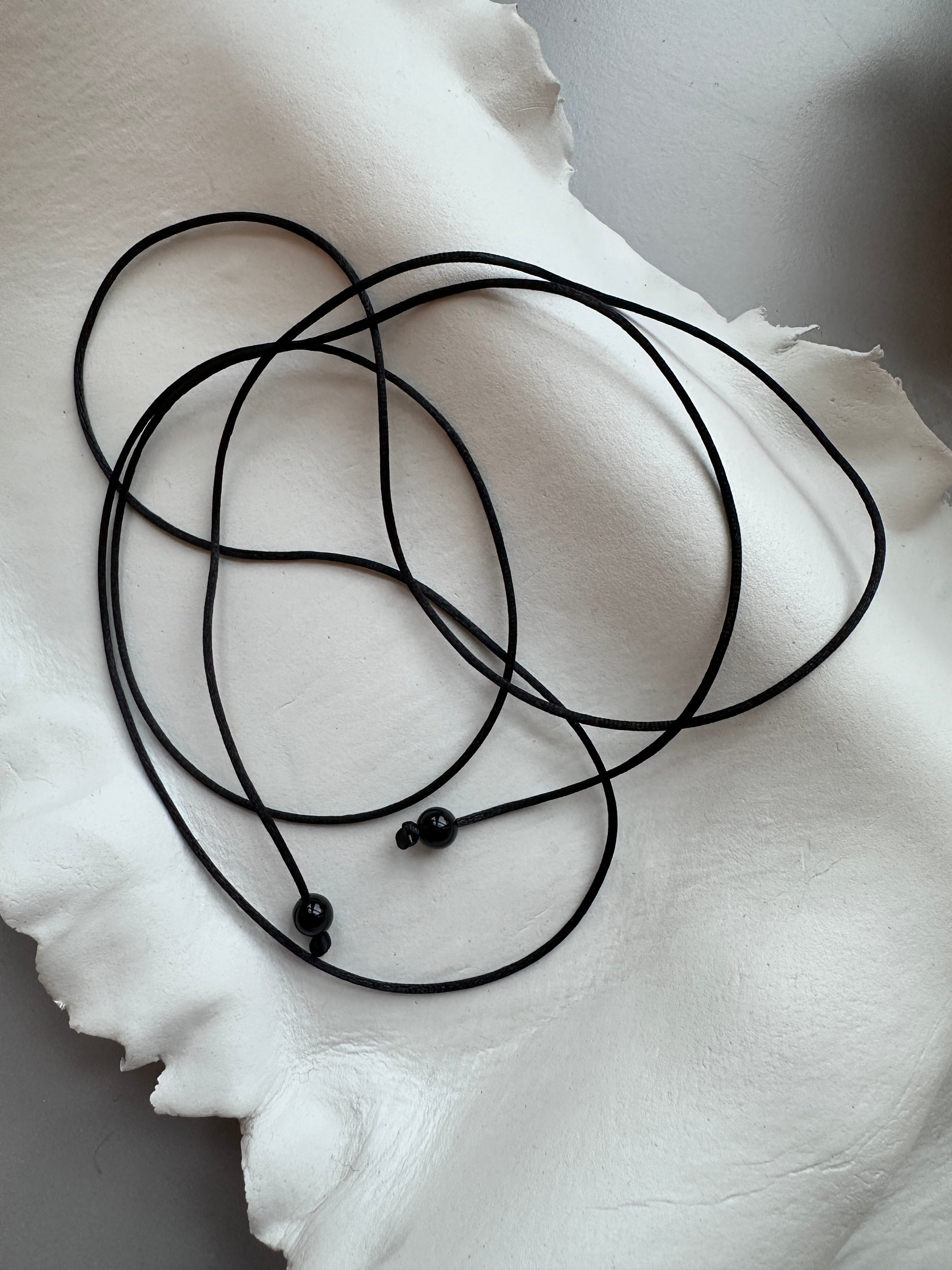 This colourful string necklace is crafted from beautiful satin cord and finished with two elegant round beads.