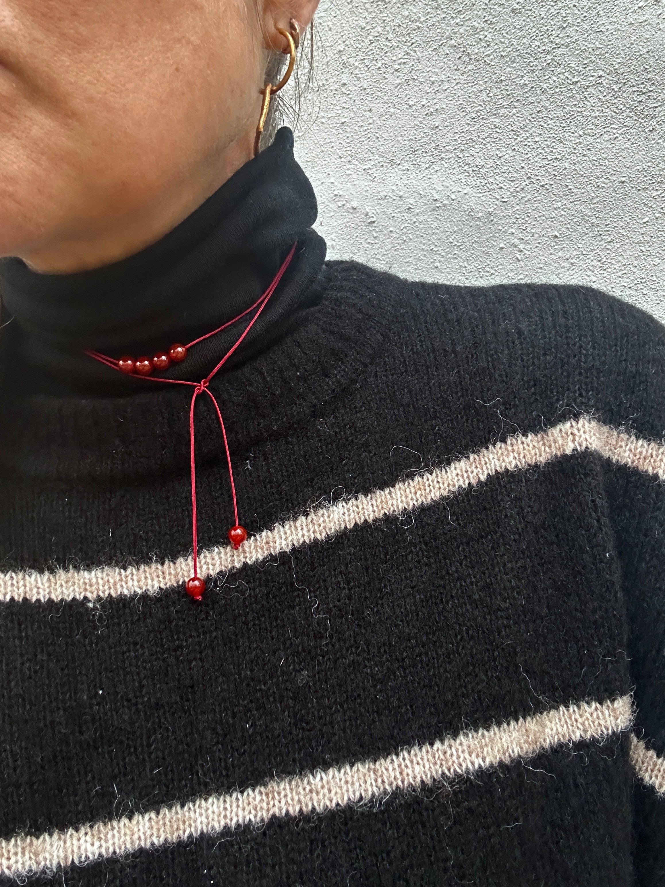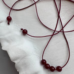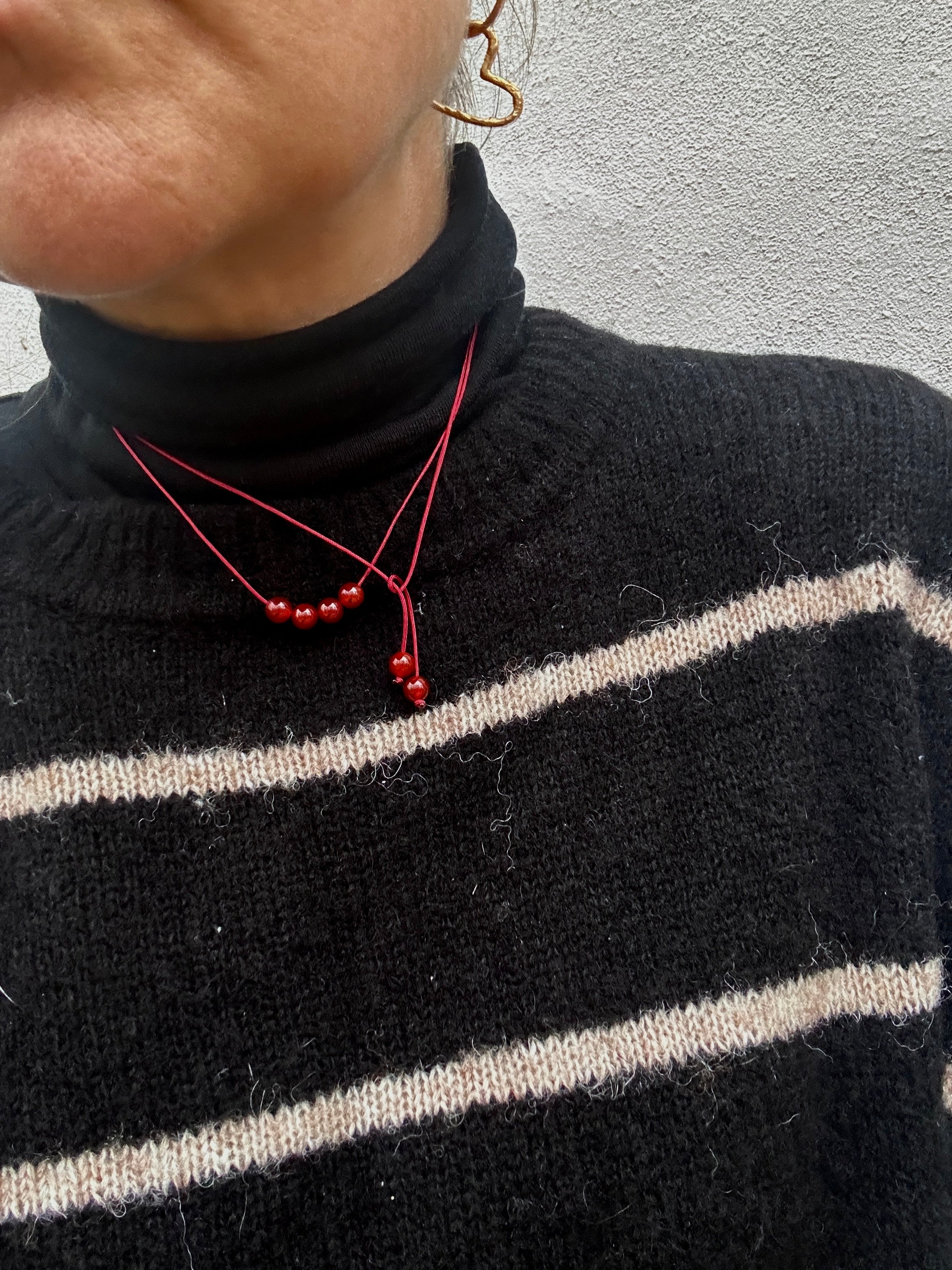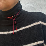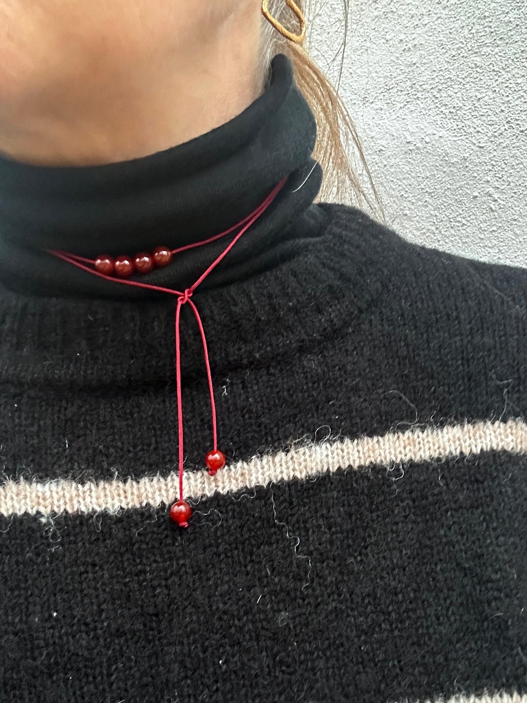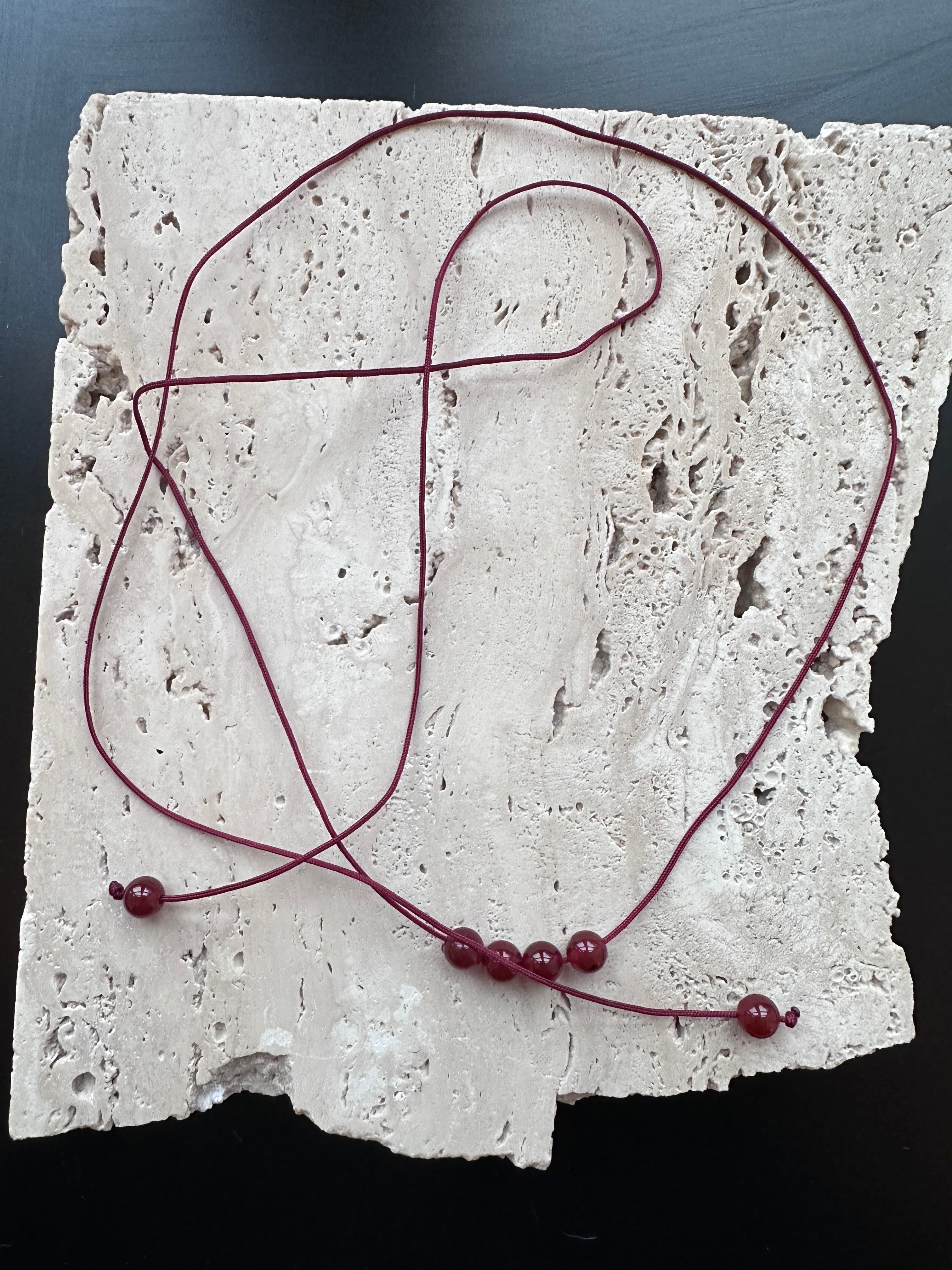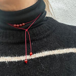 Its versatile design allows you to wear it in multiple ways—simply tie it to your desired length with a double knot. Fully adjustable, it can be styled to complement any neckline or outfit, and it can also be tied into a bow. You can move the beads and place them were ever you wish on the string.