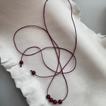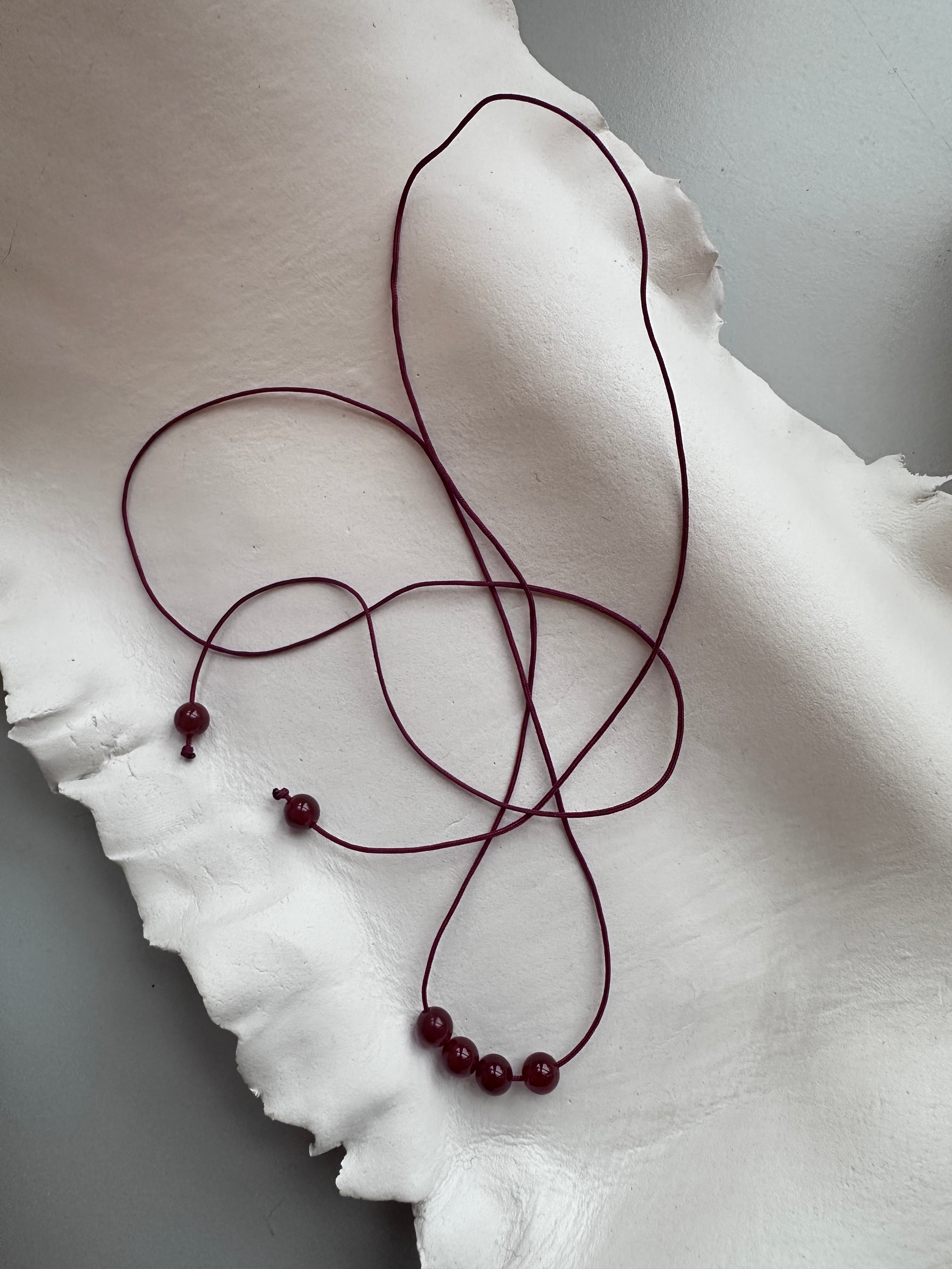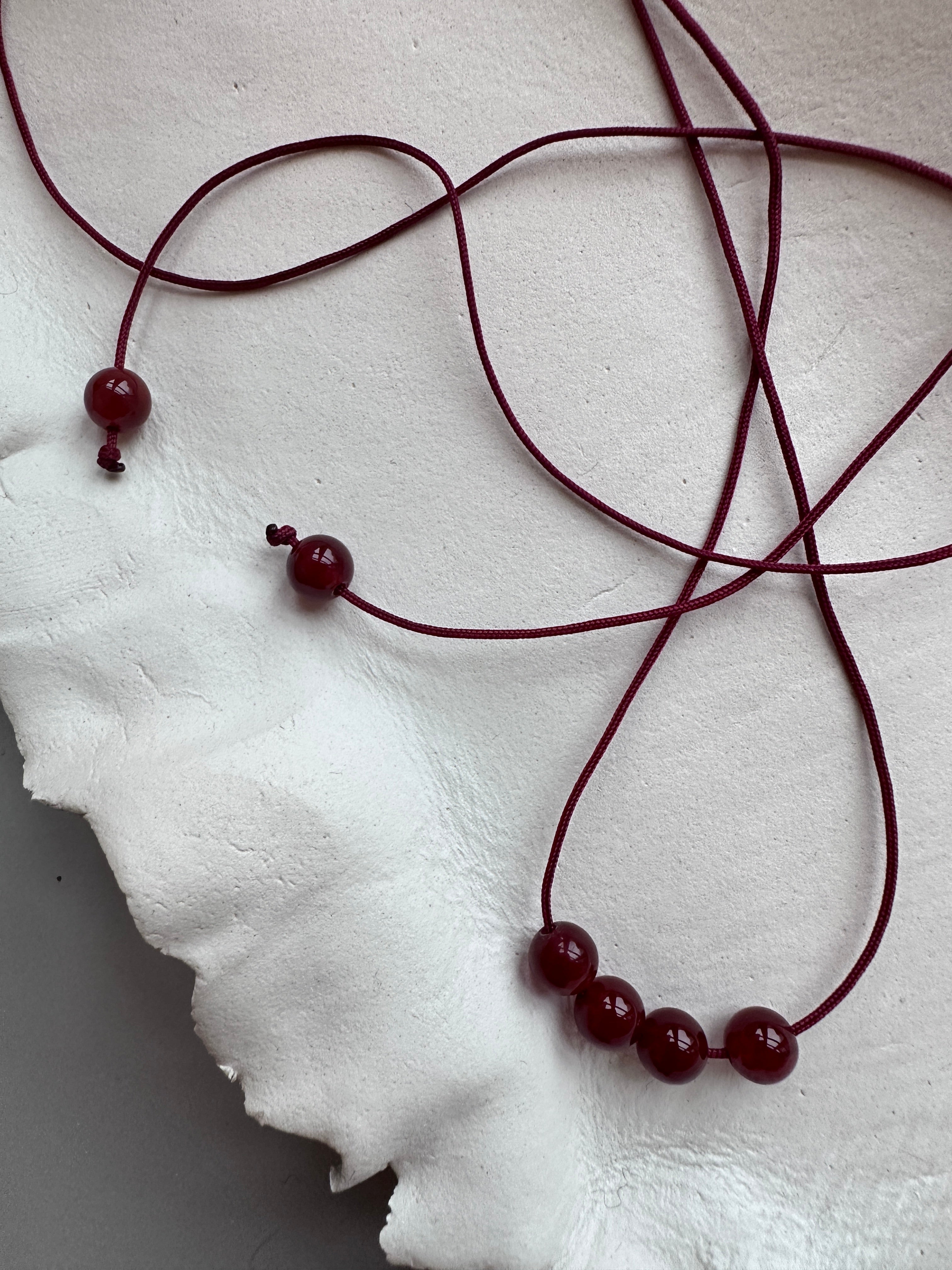 This colourful string necklace is crafted from beautiful satin cord and finished with six elegant round beads.
