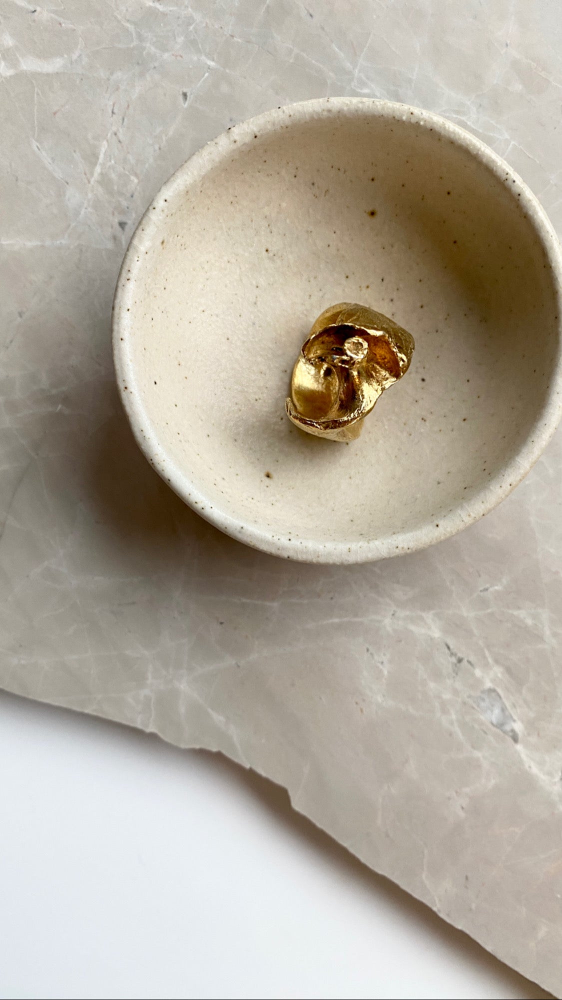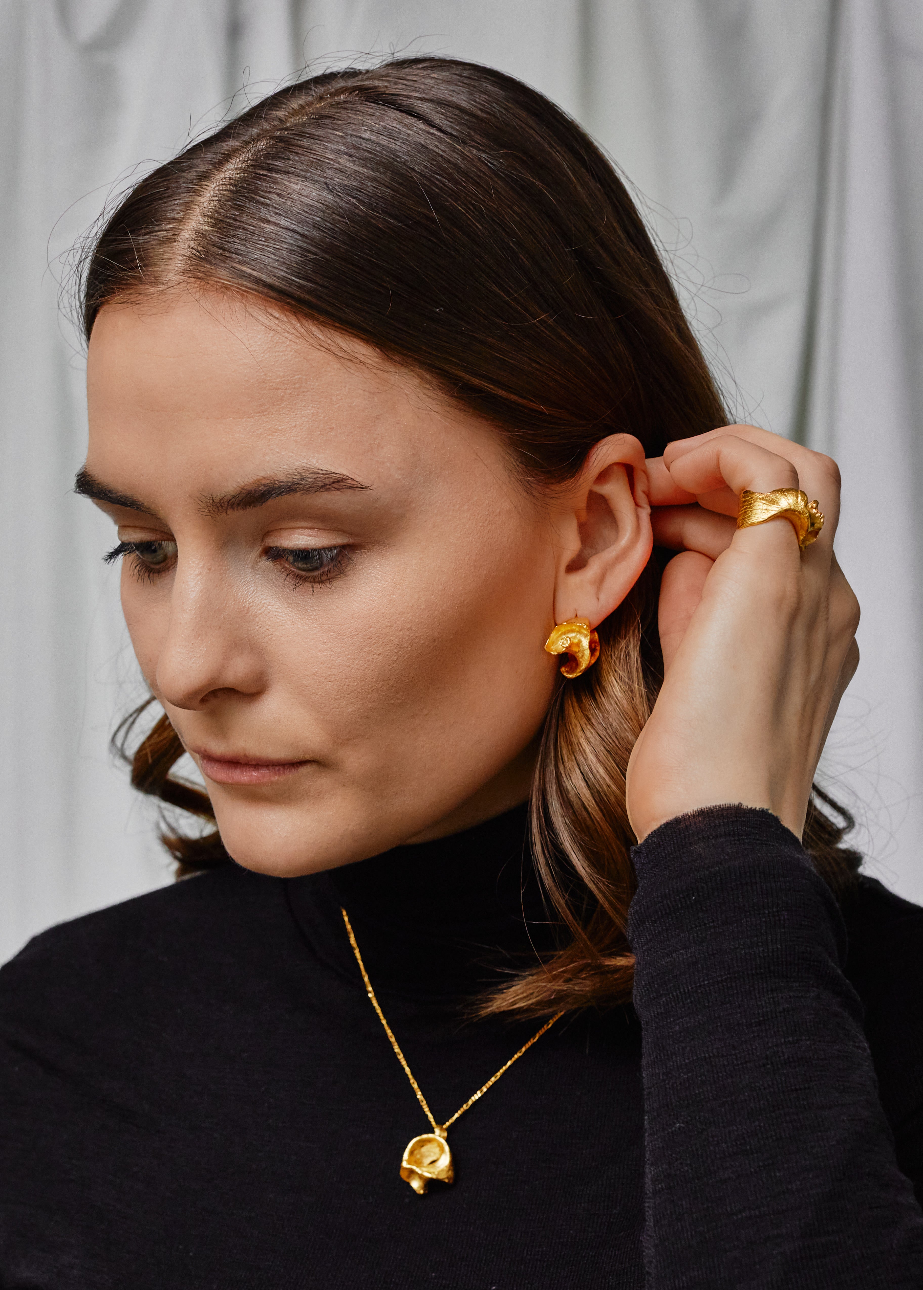 Each piece of the Coquille Collection is made from a cast of a unique shaped snail shell, found in nature. The collection is made of silver leftovers from our production, in order to avoid waste, and plated with 24kt fine gold.