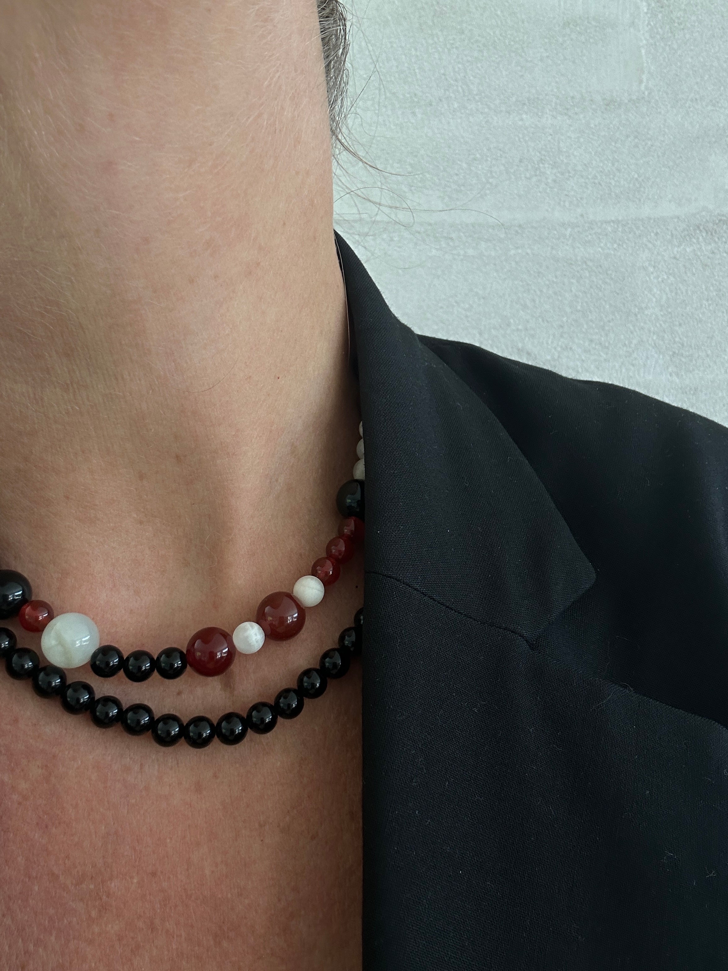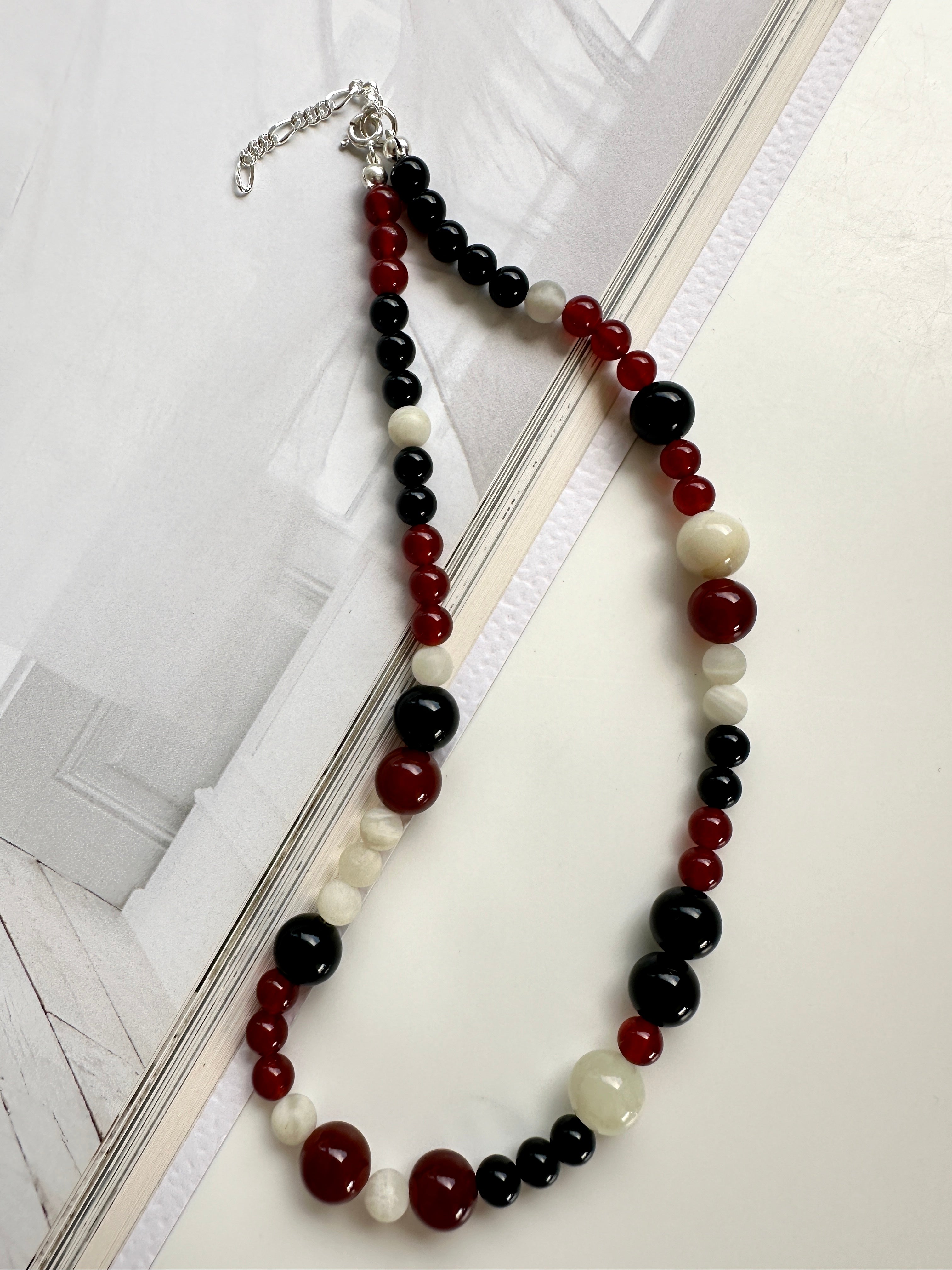 This multi coloured bracelet features an array of exclusive dark red carnelian stones, elegant black onyx stones, and luxurious moonstones in various sizes.