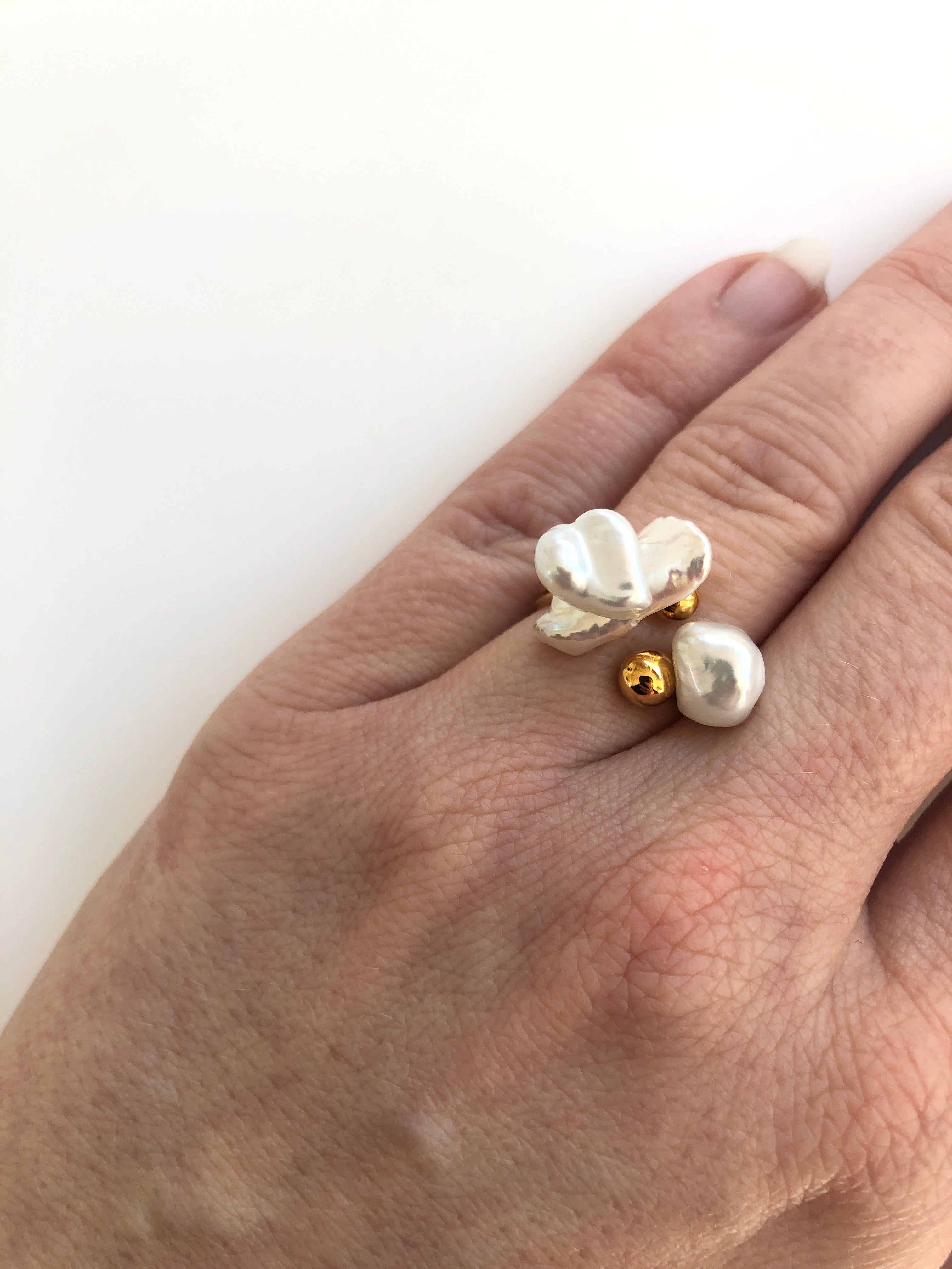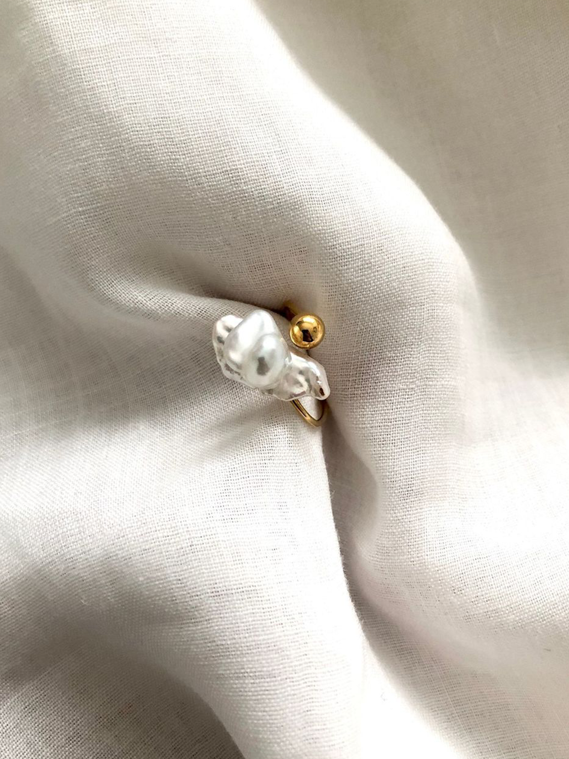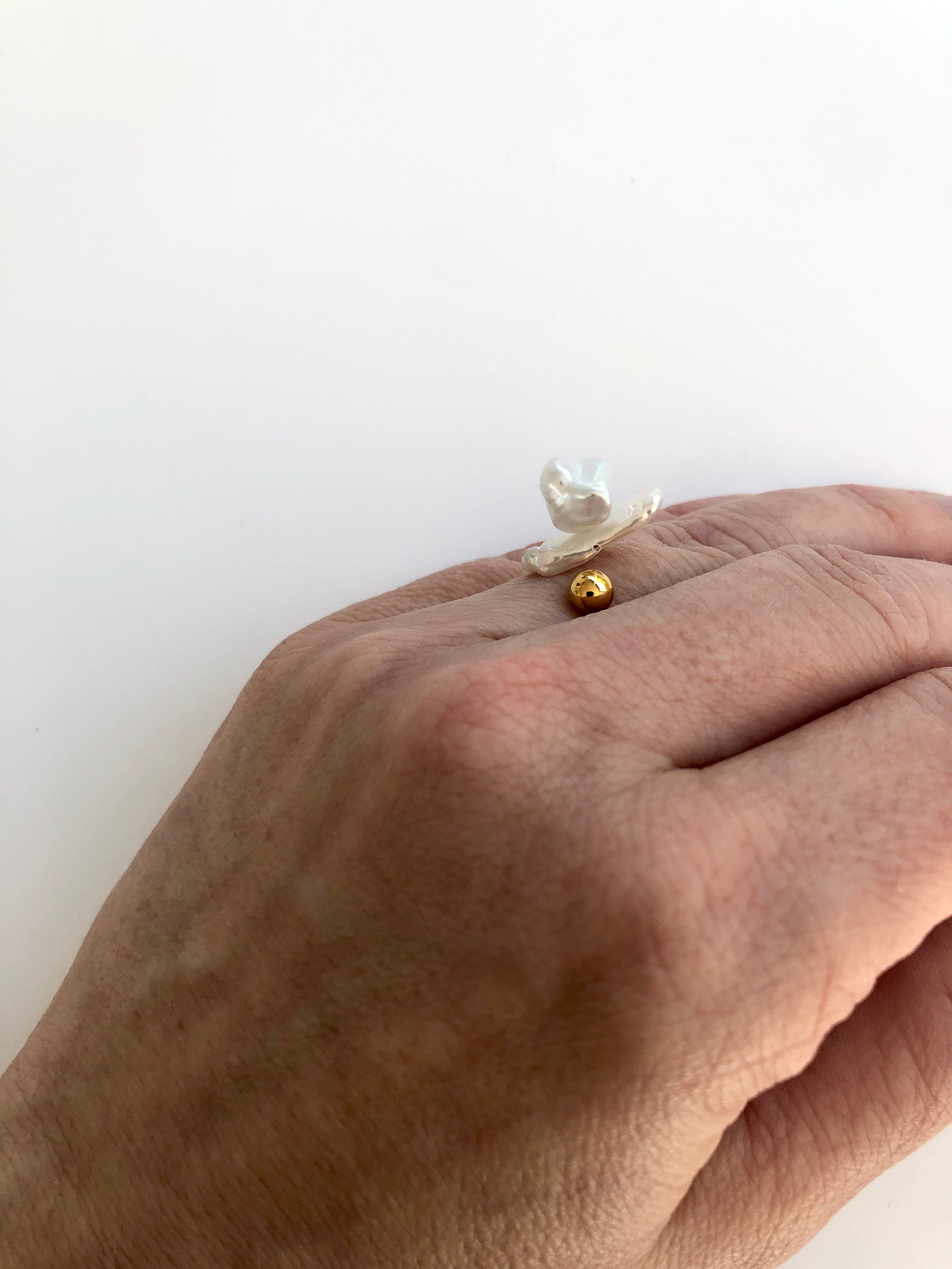 This unique Ring is designed with love for nordic minimalism with a feminine twist. The combination of Baroque pearls and a simply ball makes this ring one of a kind.