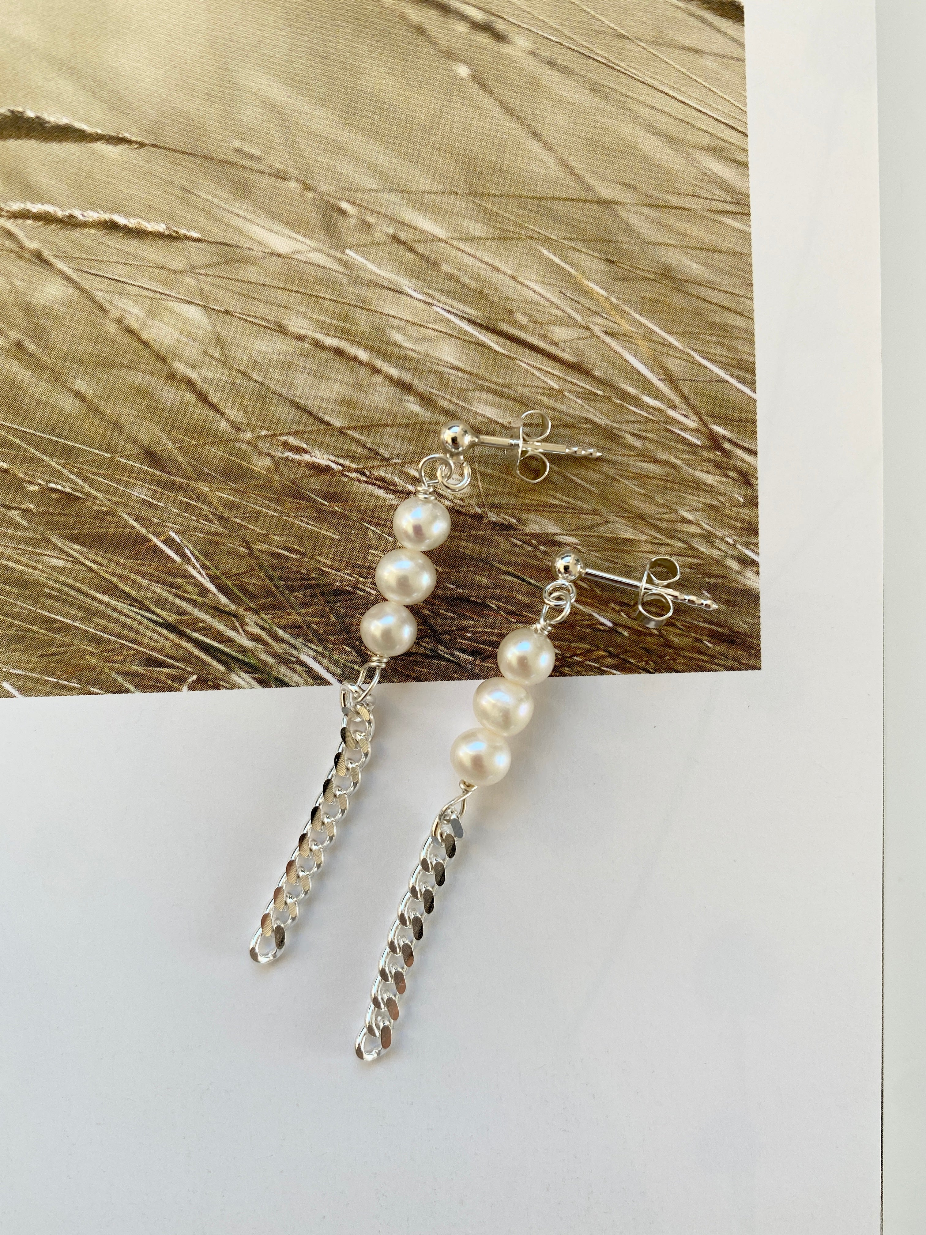 These unique earrings are a combination of classic baroque pearls and modern 3 mm panzer chains - designed with love for a playful mind.