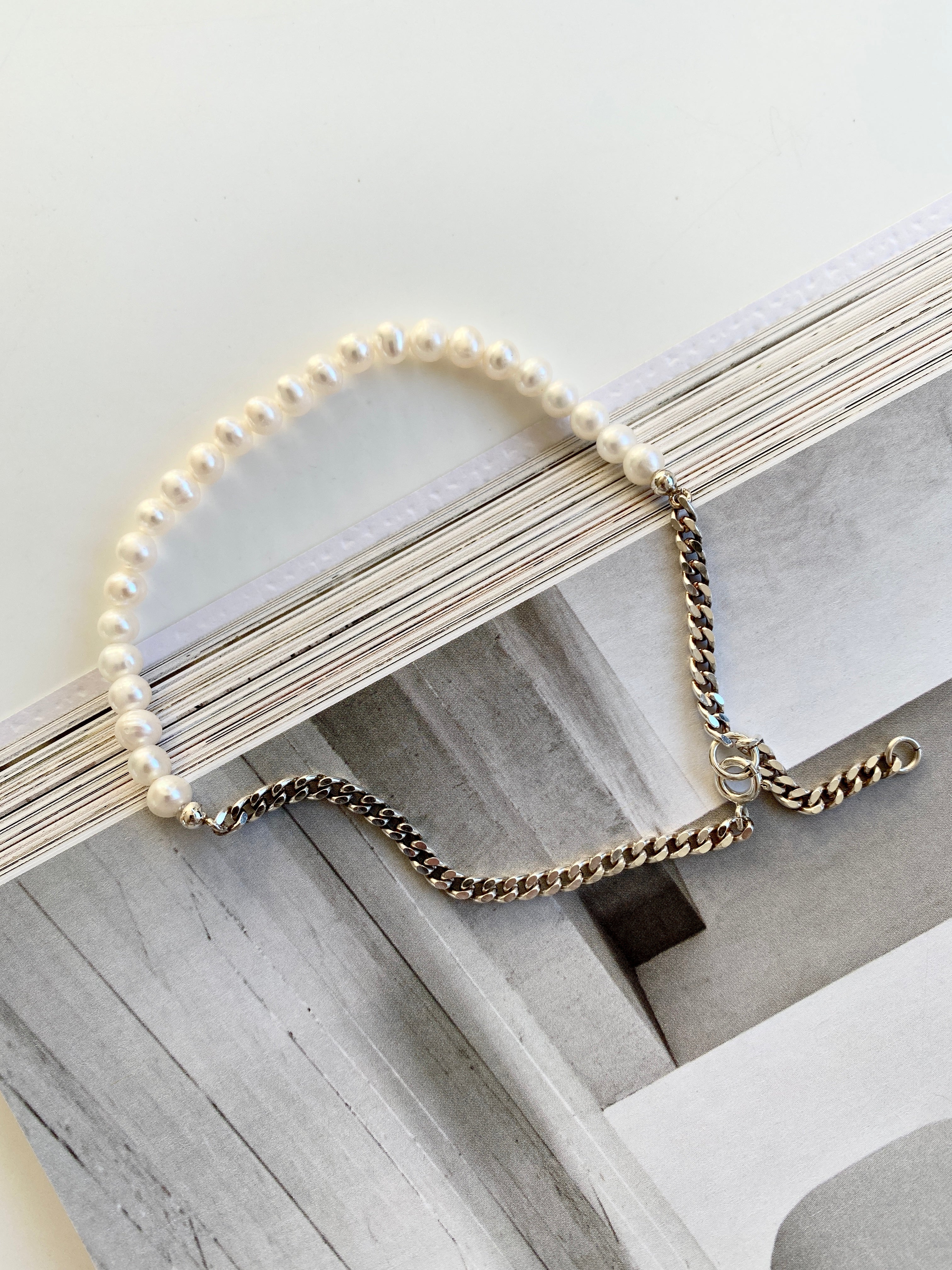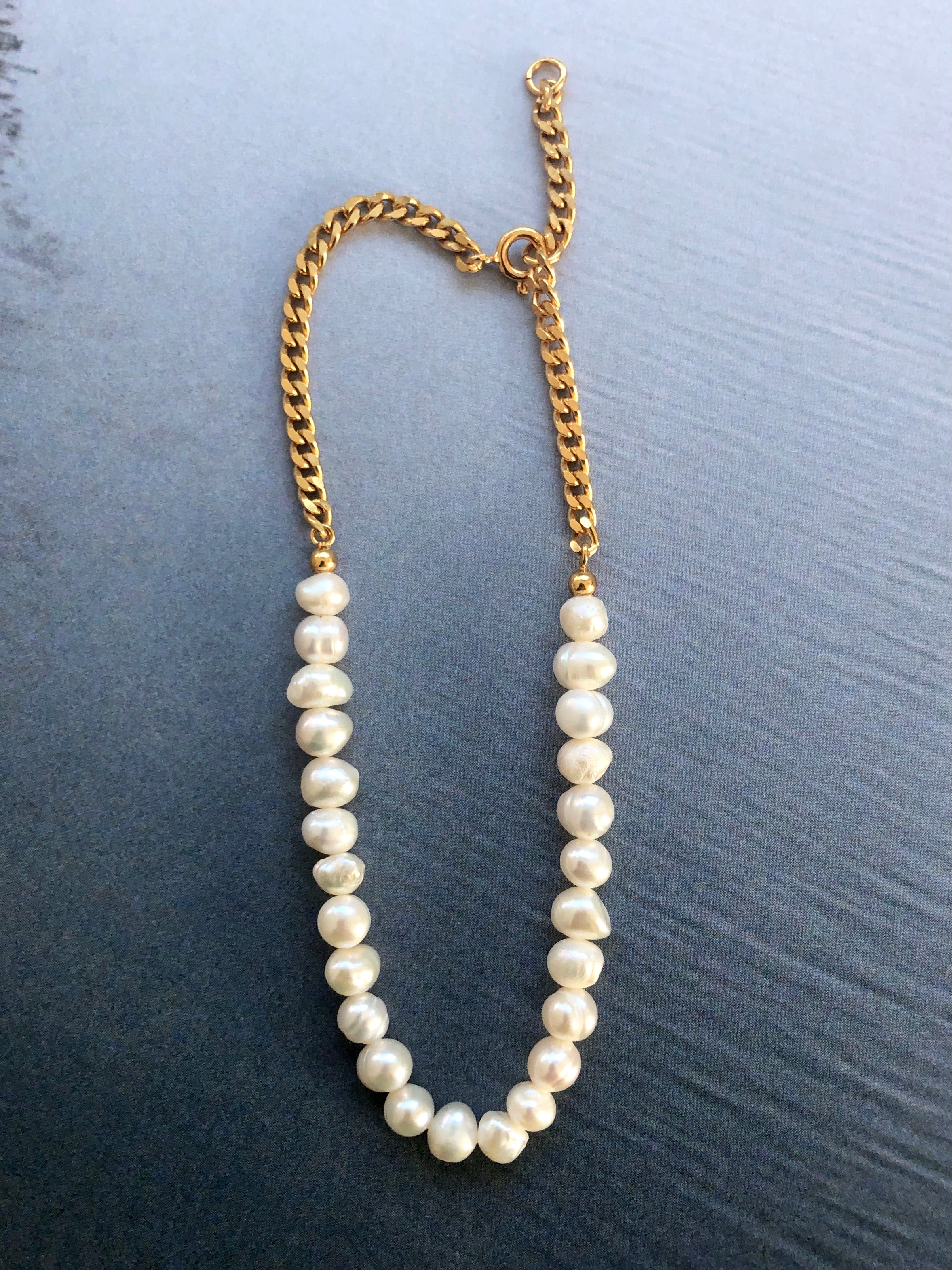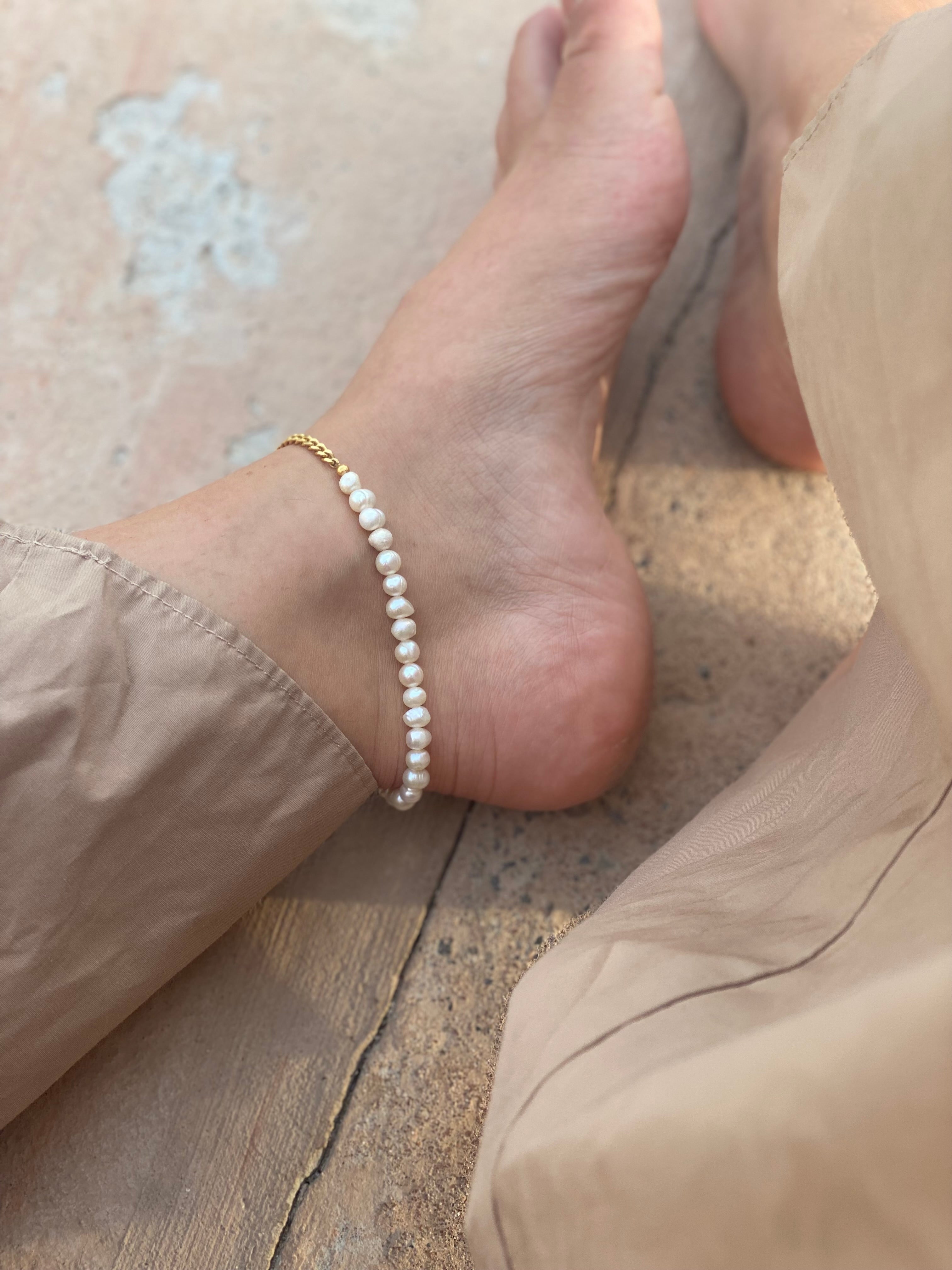 This unique anklet is a combination of classic baroque pearls and a modern 3 mm panzer chain - designed with love for a playful mind.