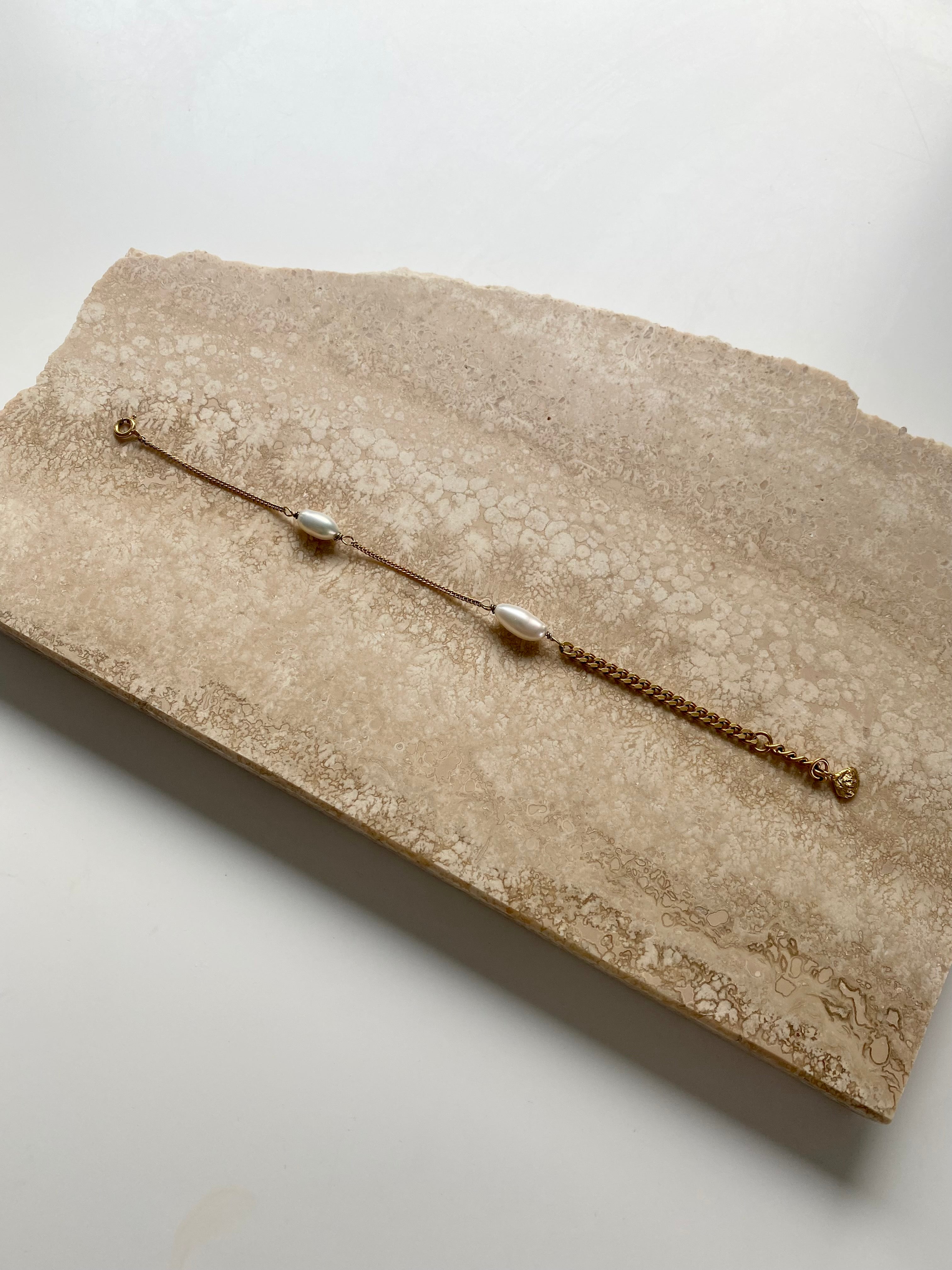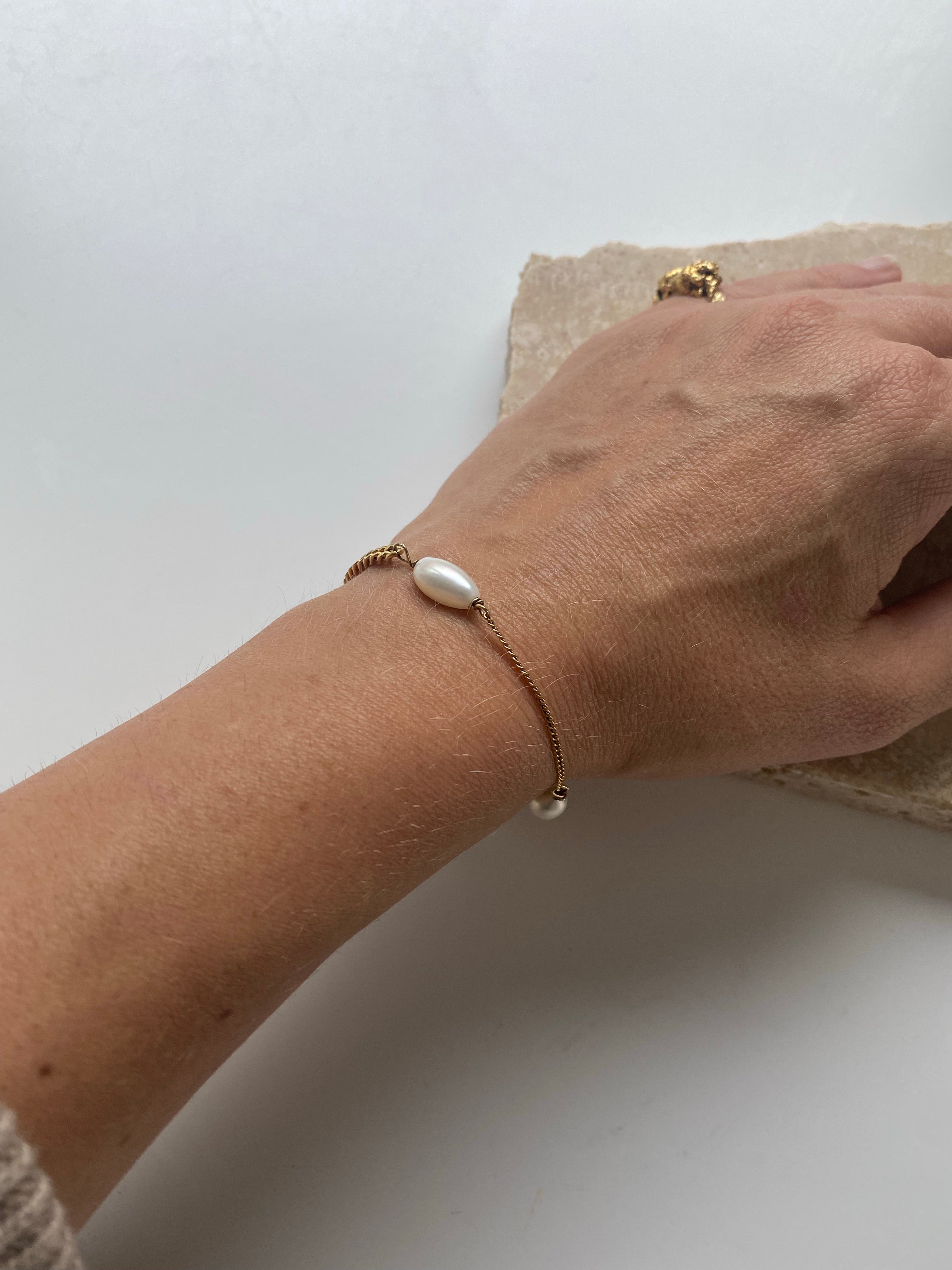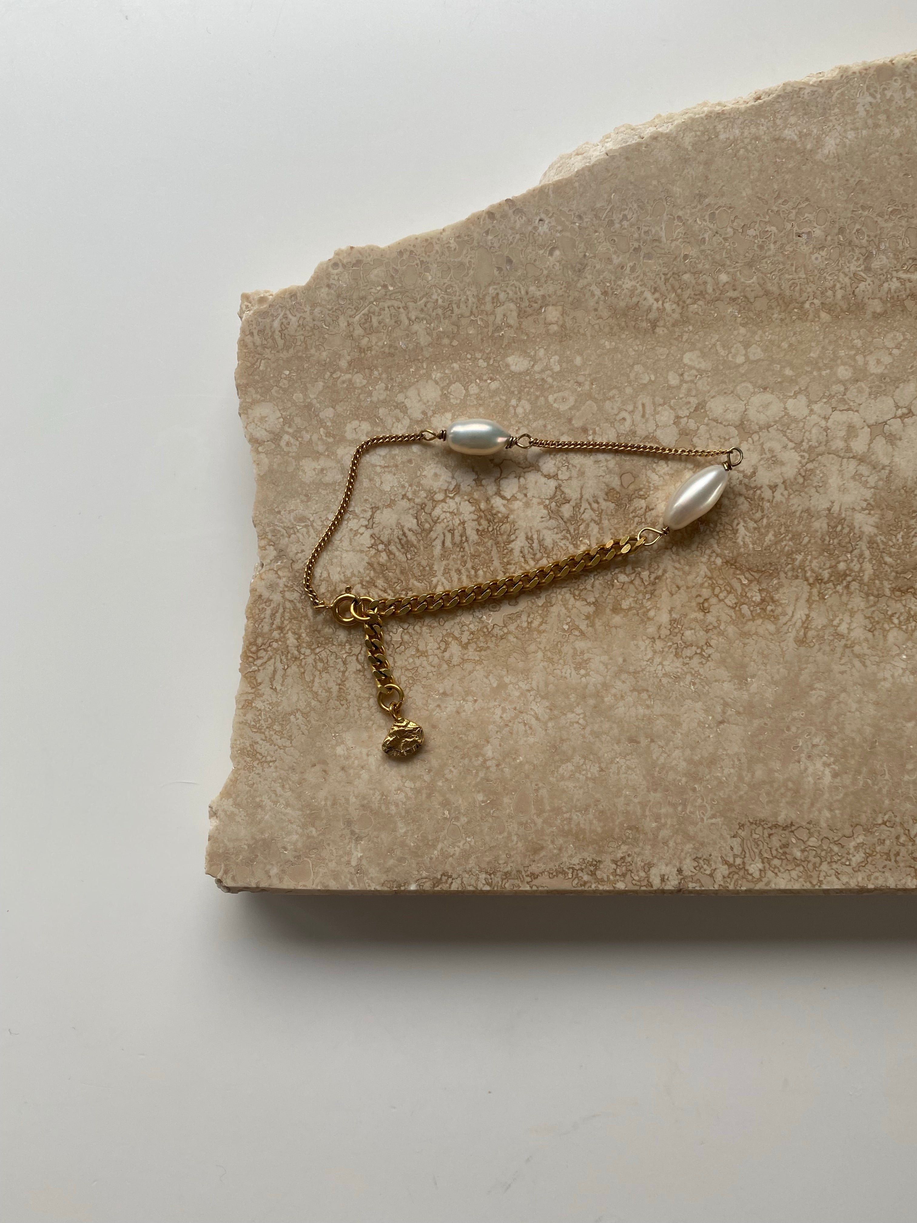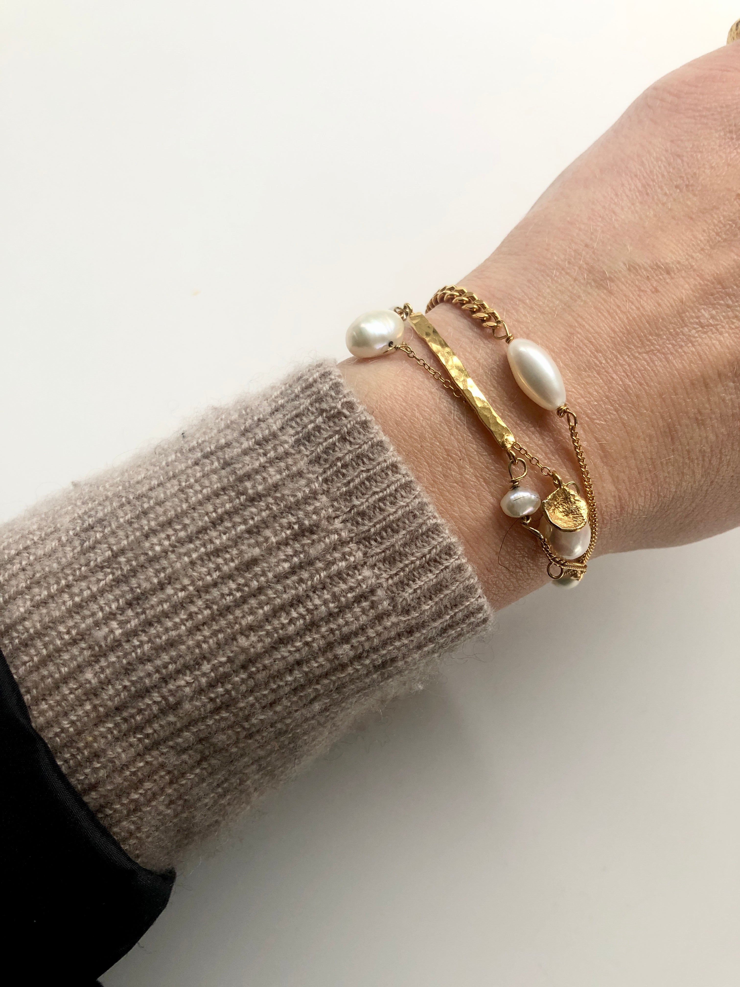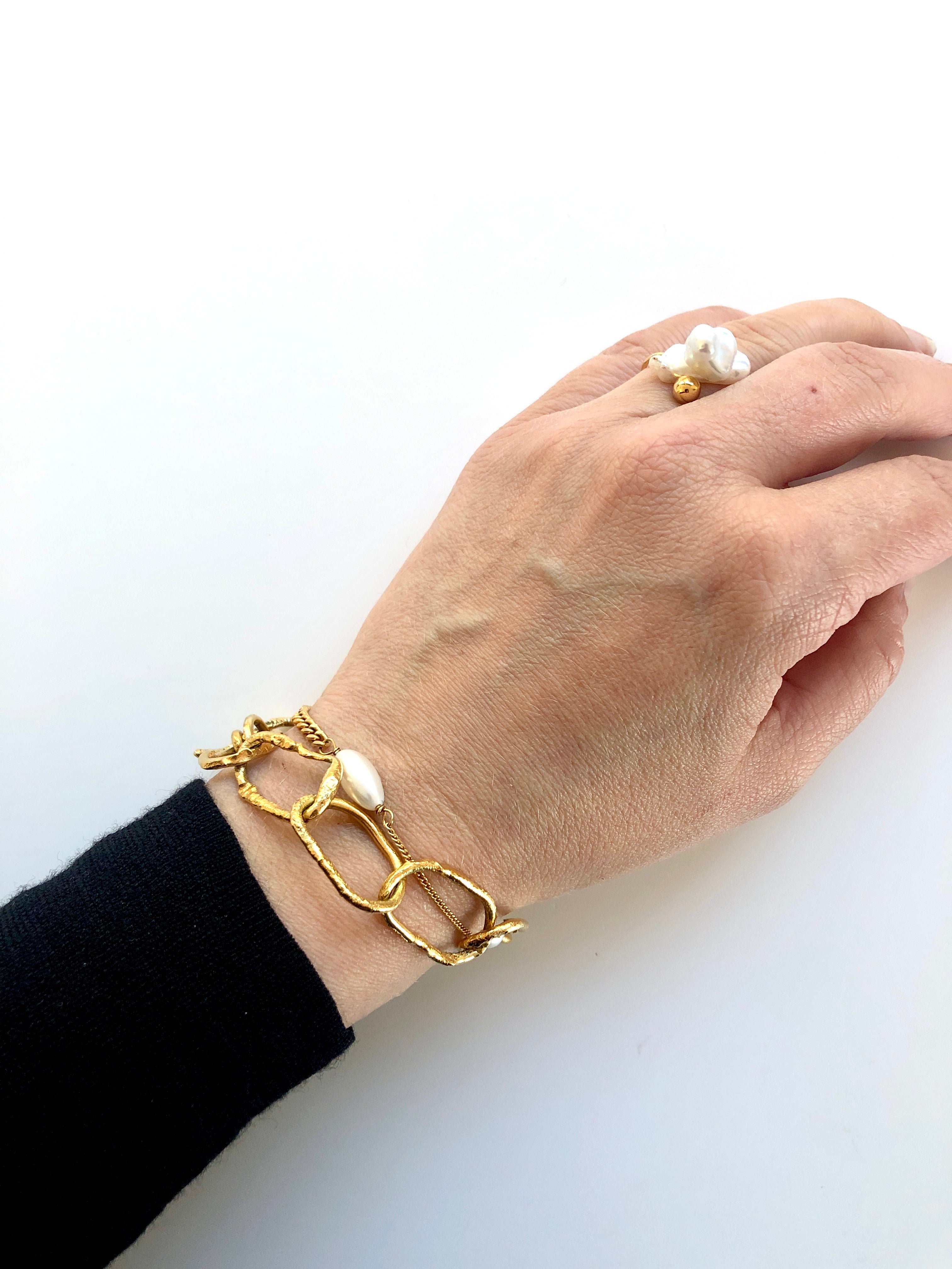 The Picasso bracelet combines classic pearls with a bold chunky chain, and a thin chain, giving it a unique and stylish look. The minimal structured surface flame pendant adds a perfect finishing touch.