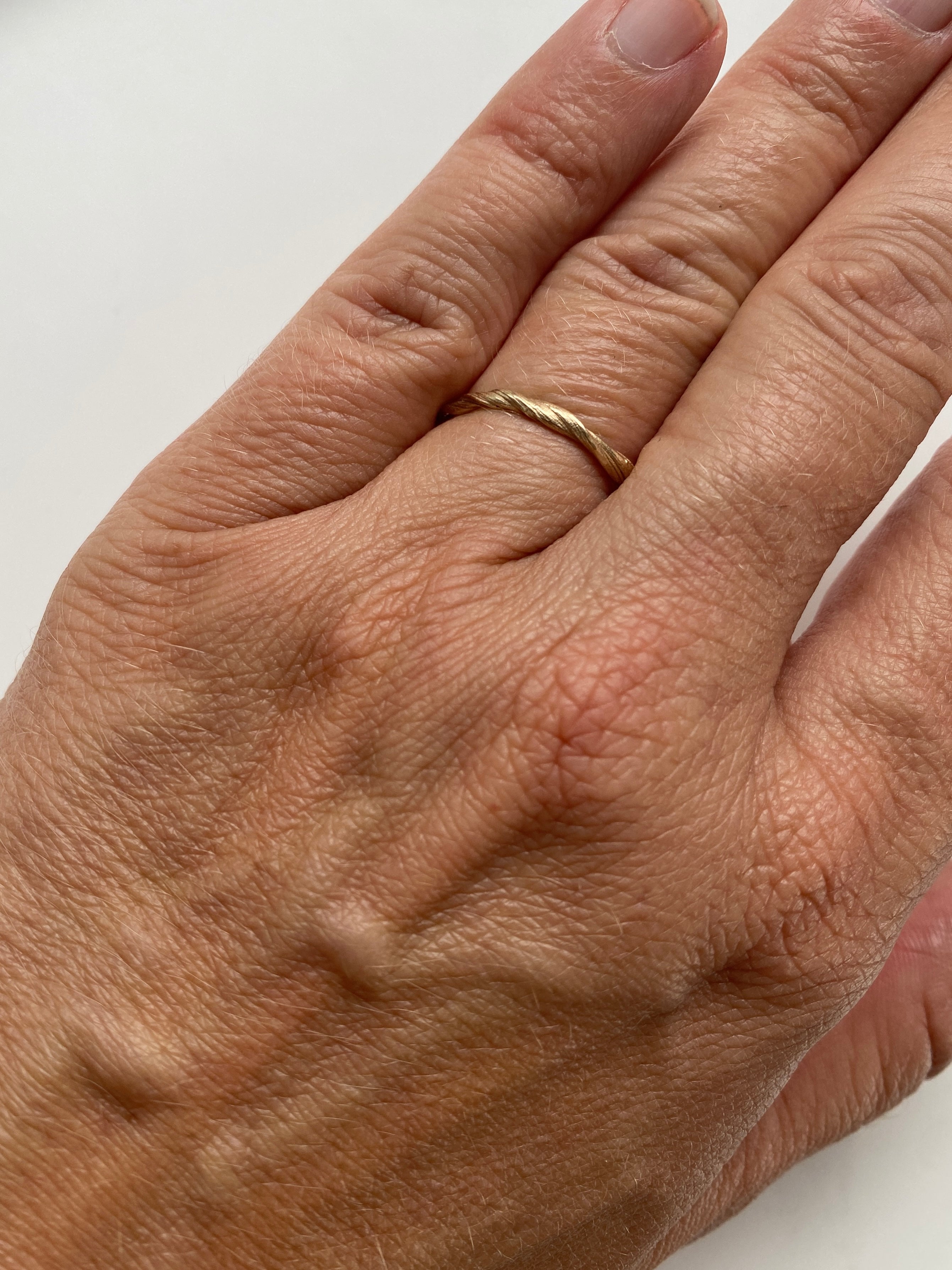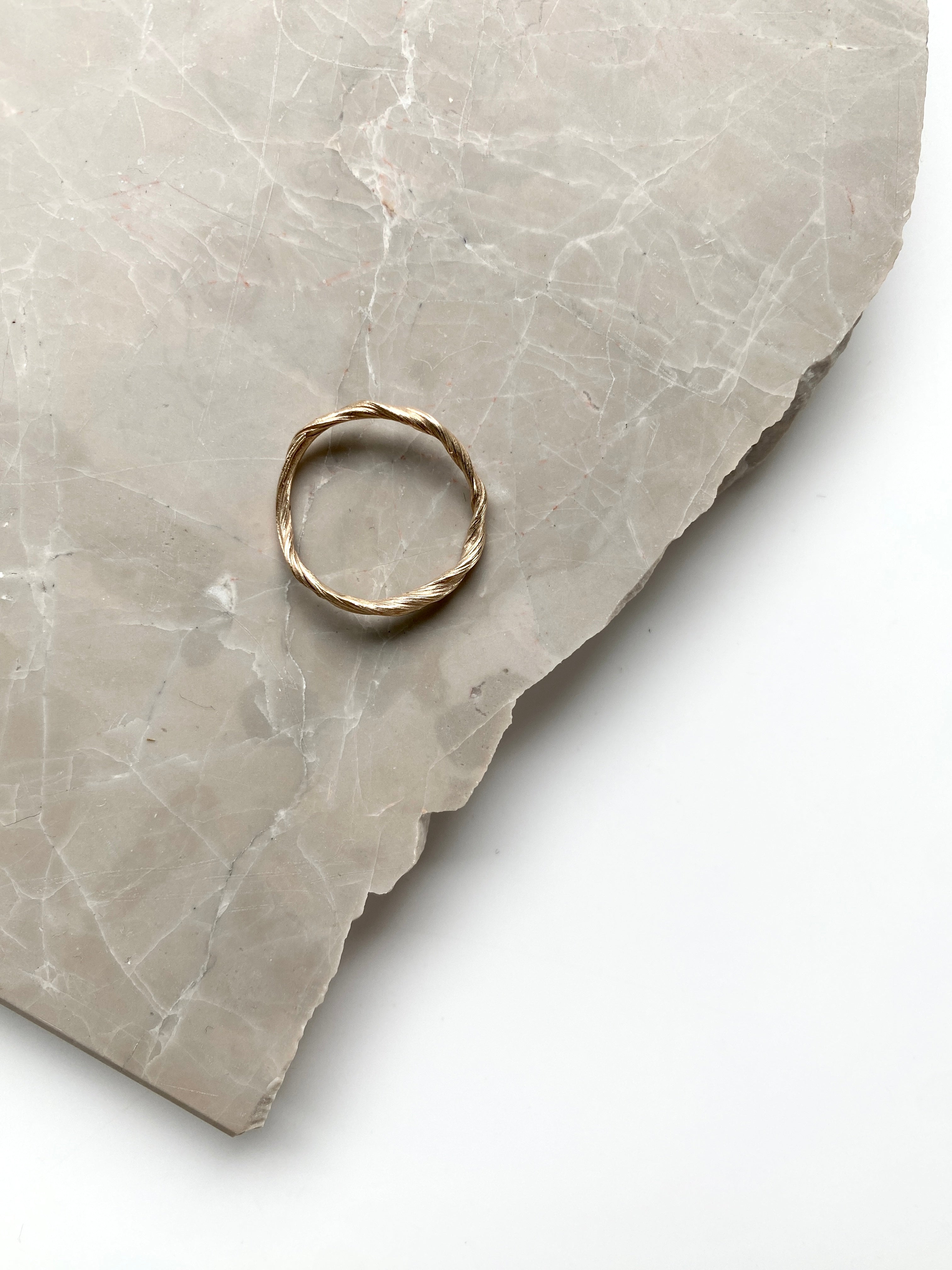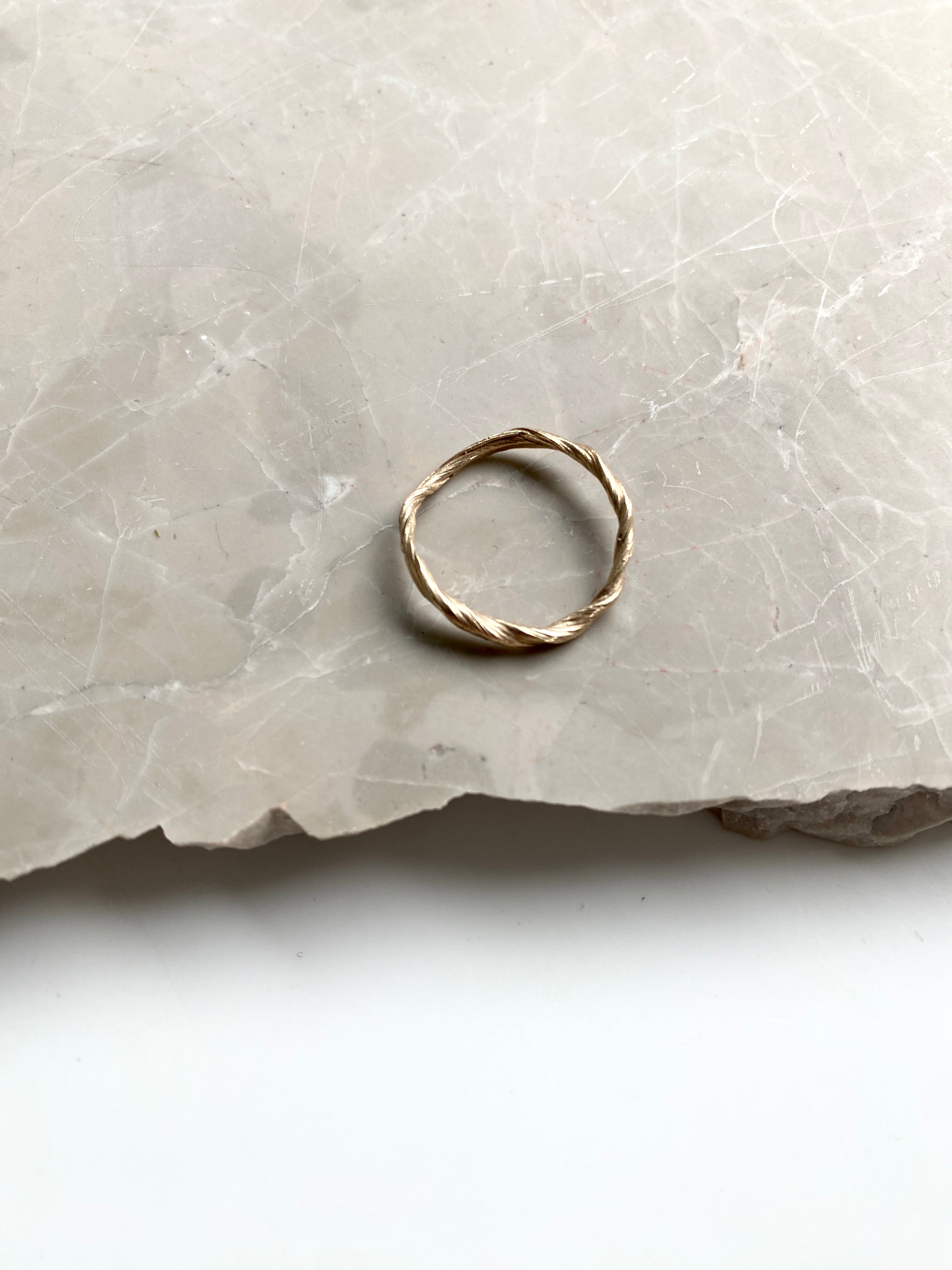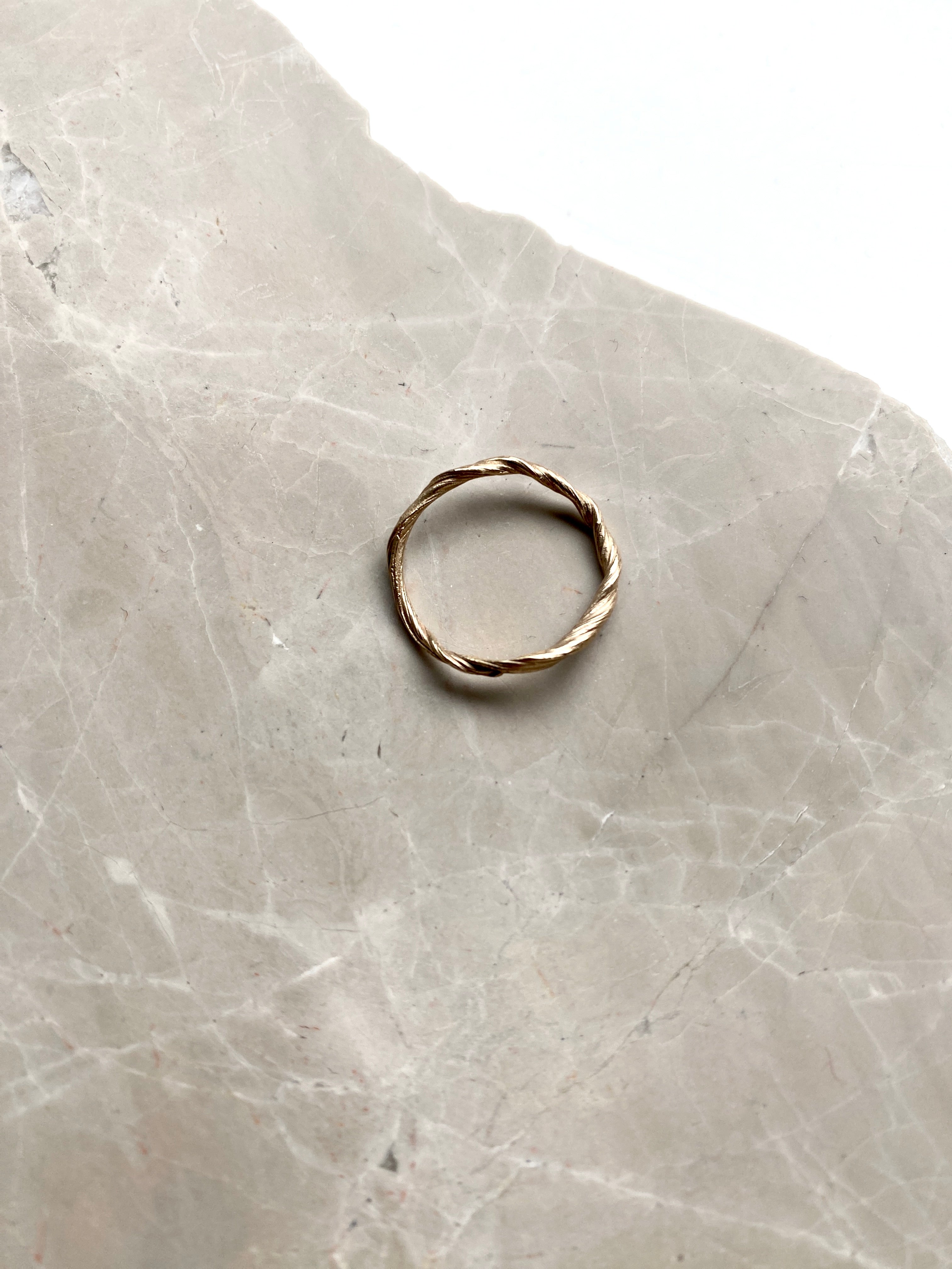 The Twirl Ring is crafted with precision and love to result in a unique shape. The design is created using a traditional Japanese wax method called Mitsuro Hikime. This technique gives the ring a distinct twisted surface and silhouette. The ring is made in 14kt solid gold.